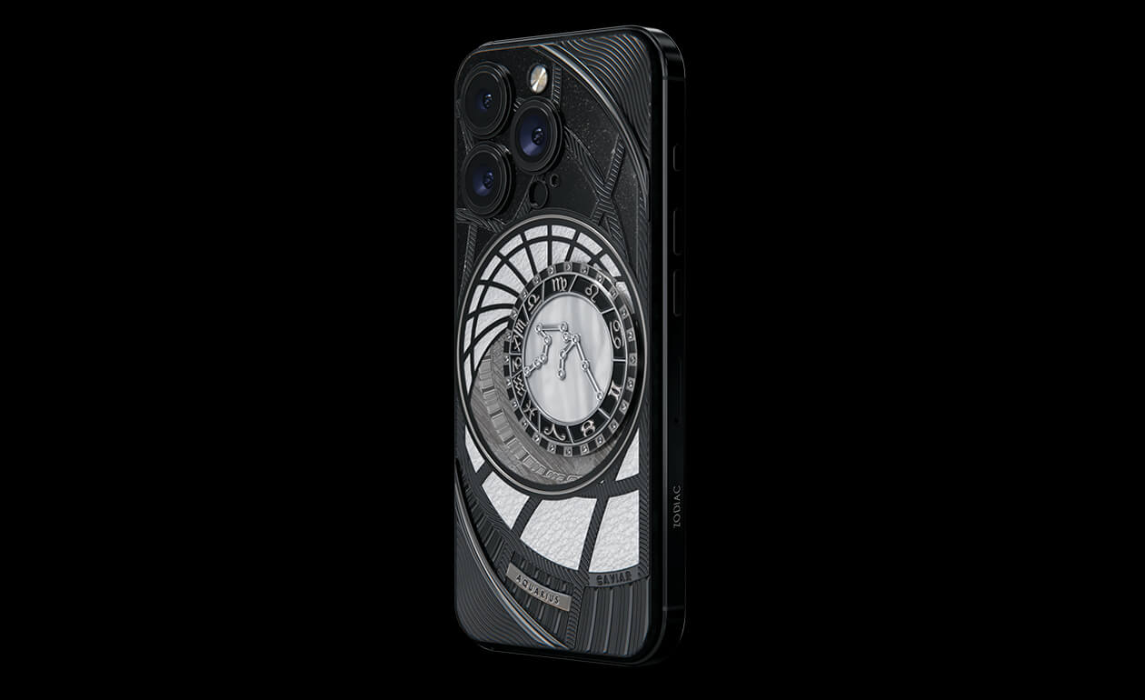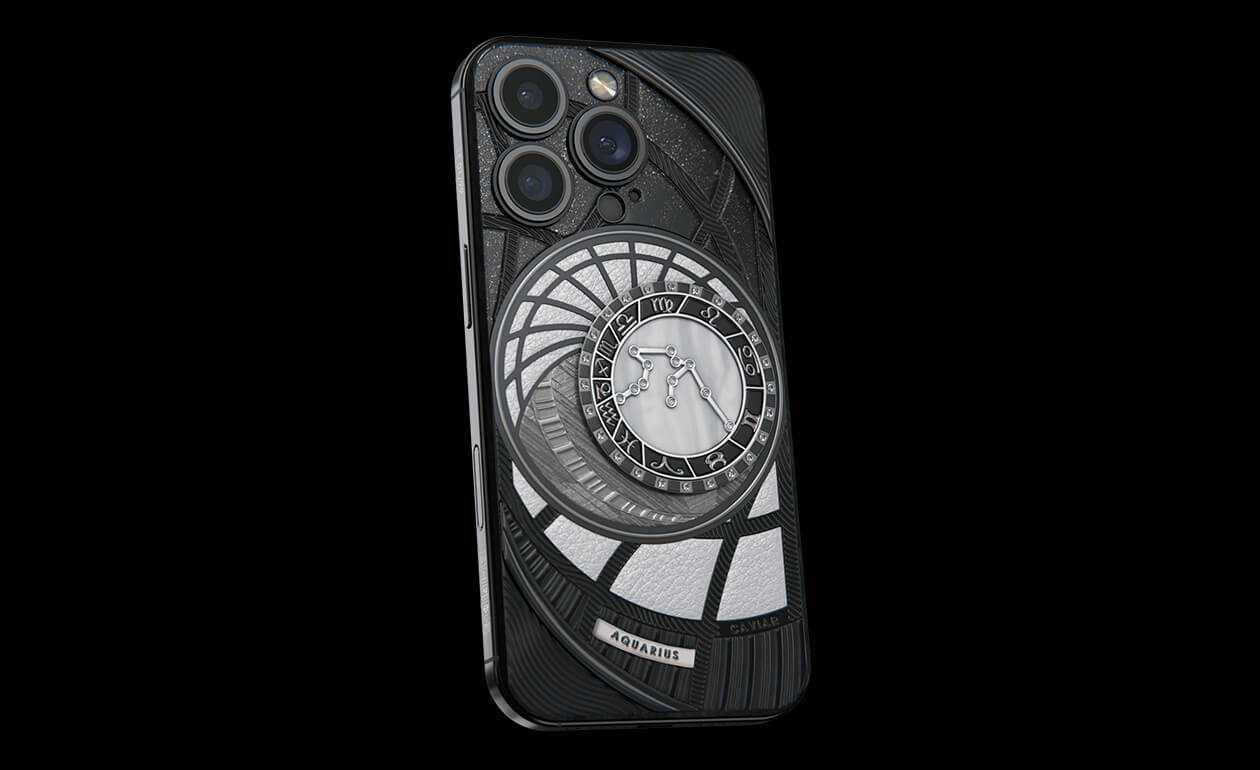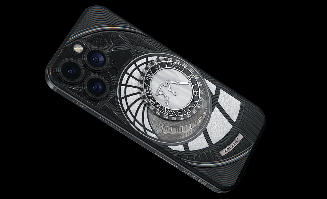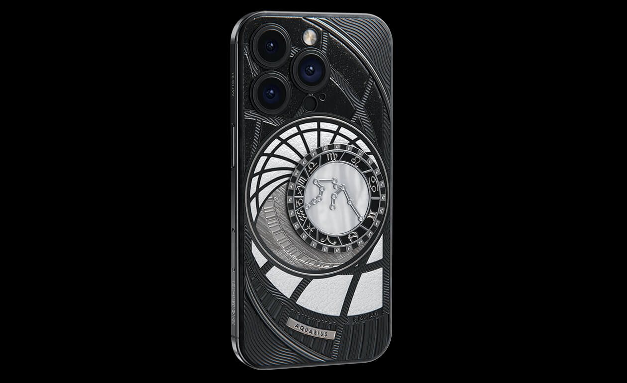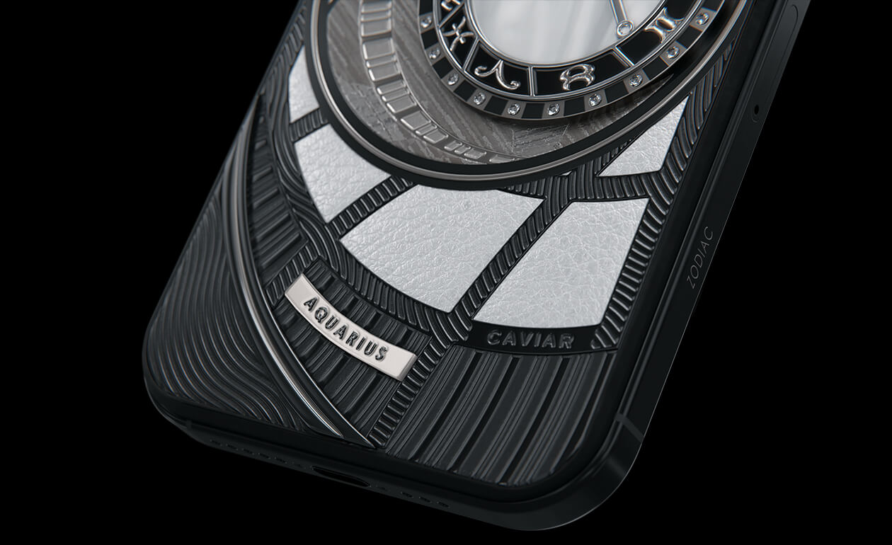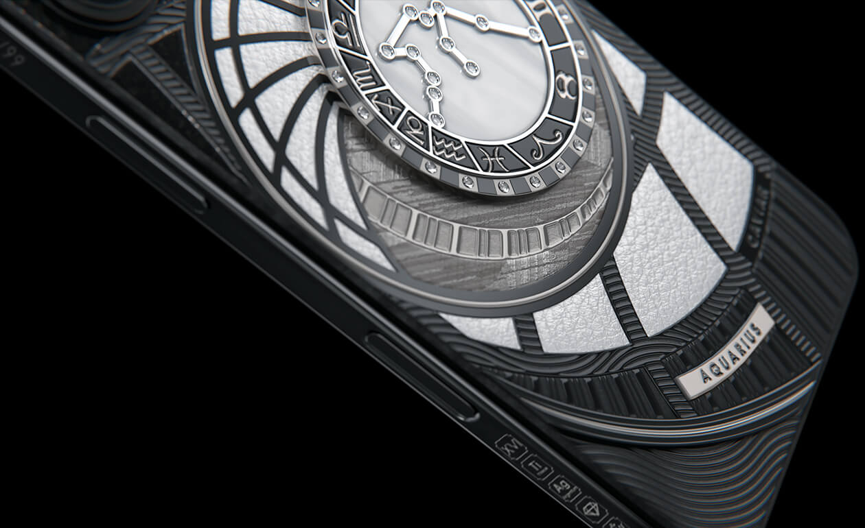 Водолеи, сегодня мы представляем вам Aquarius. На корпусе смартфона есть небесный свод с вашими звездами. Это панно из 24 кристаллов Swarovski, созданное на черном титане с PVD-покрытием. Мы подчеркнули сияние бриллиантовой россыпи с помощью белого композита и завершили композицию фрагментом метеорита на телячьей коже белоснежного цвета.