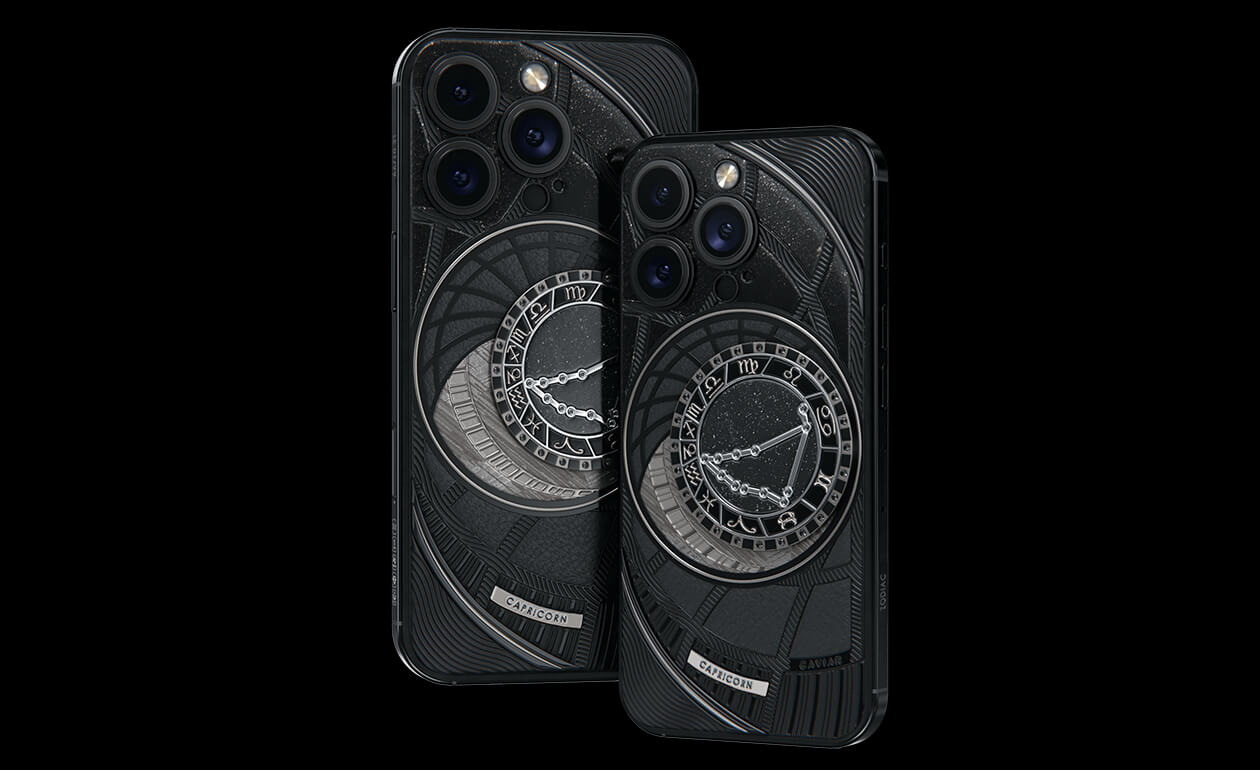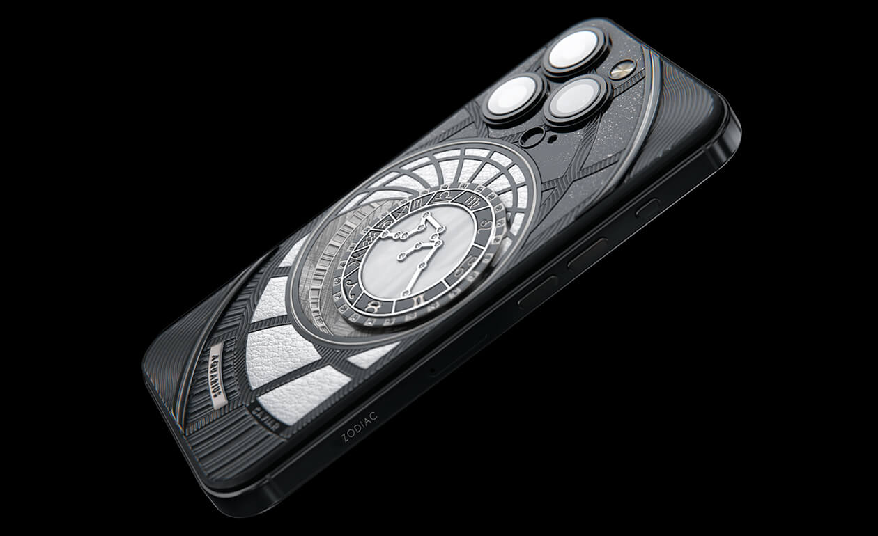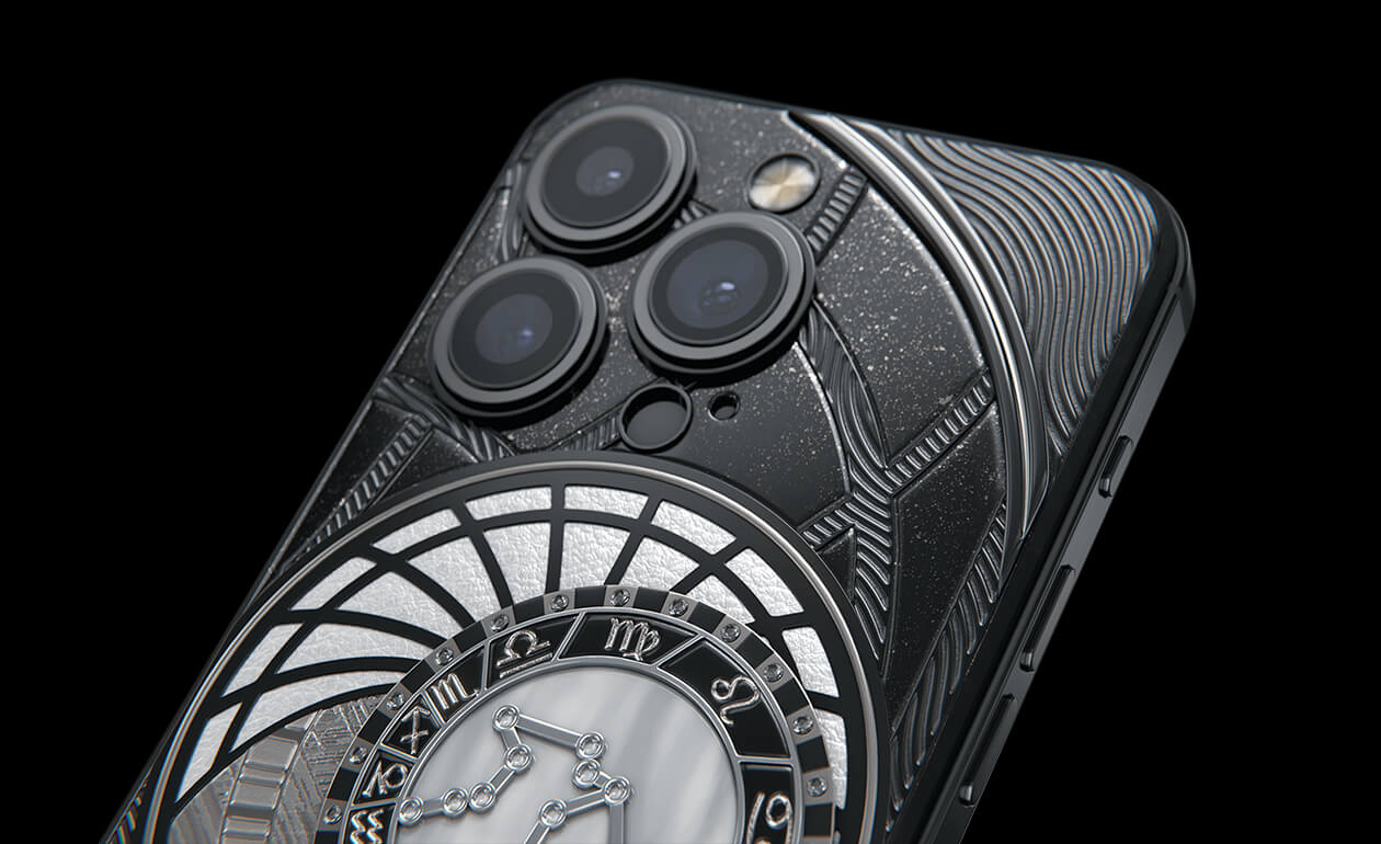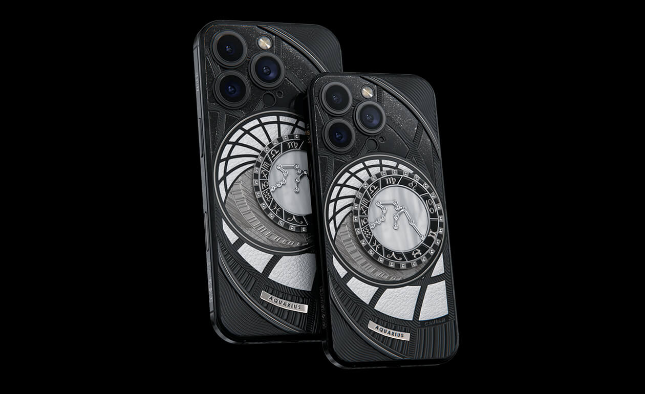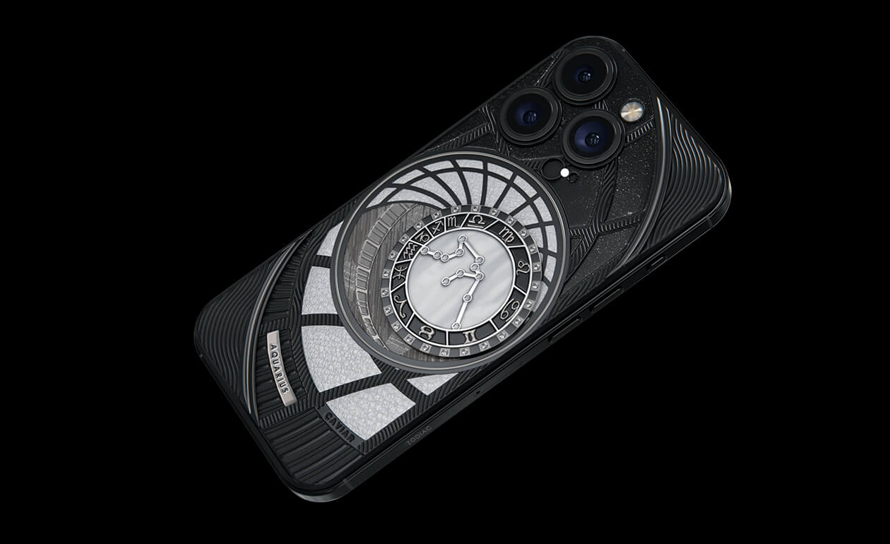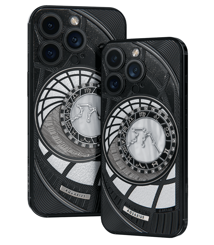 Водолеи, сегодня мы представляем вам Aquarius. На корпусе смартфона есть небесный свод с вашими звездами. Это панно из 24 кристаллов Swarovski, созданное на черном титане с PVD-покрытием. Мы подчеркнули сияние бриллиантовой россыпи с помощью белого композита и завершили композицию фрагментом метеорита на телячьей коже белоснежного цвета.