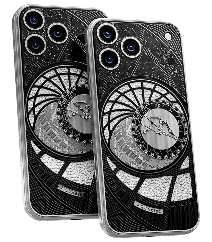 Водолеи, сегодня мы представляем вам Aquarius. На корпусе смартфона есть небесный свод с вашими звездами. Это панно из 24 кристаллов Swarovski, созданное на черном титане с PVD-покрытием. Мы подчеркнули сияние бриллиантовой россыпи с помощью белого композита и завершили композицию фрагментом метеорита на телячьей коже белоснежного цвета.