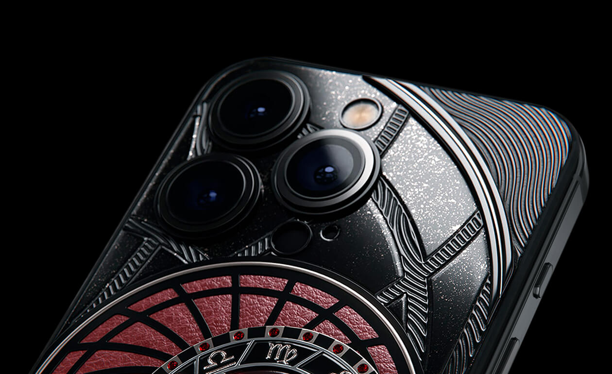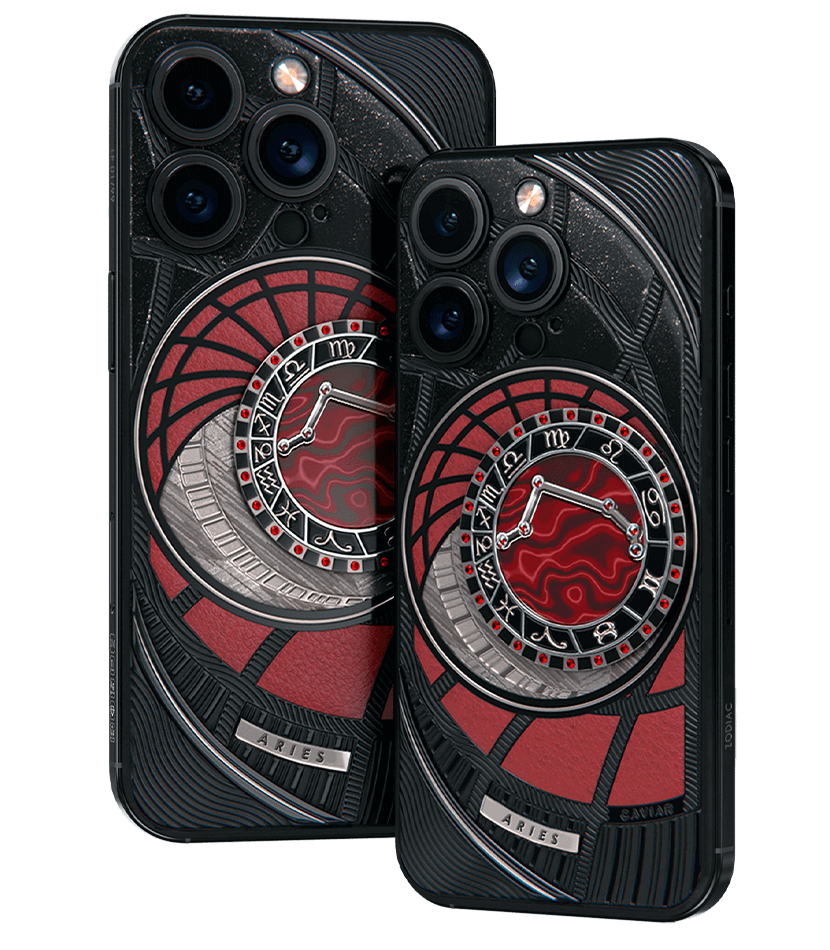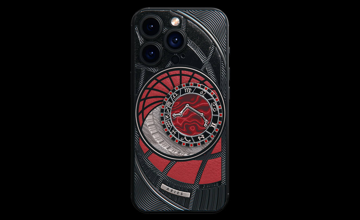 Овны, сегодня мы представляем вам Aries. На корпусе смартфона есть небесный свод с вашими счастливыми звездами. Это панно из 24 рубинов, созданное на черном титане с PVD-покрытием. Мы подчеркнули сияние рубиновой россыпи с помощью пластины из красного композита и завершили композицию фрагментом метеорита на телячьей коже в ярком карминовом оттенке.