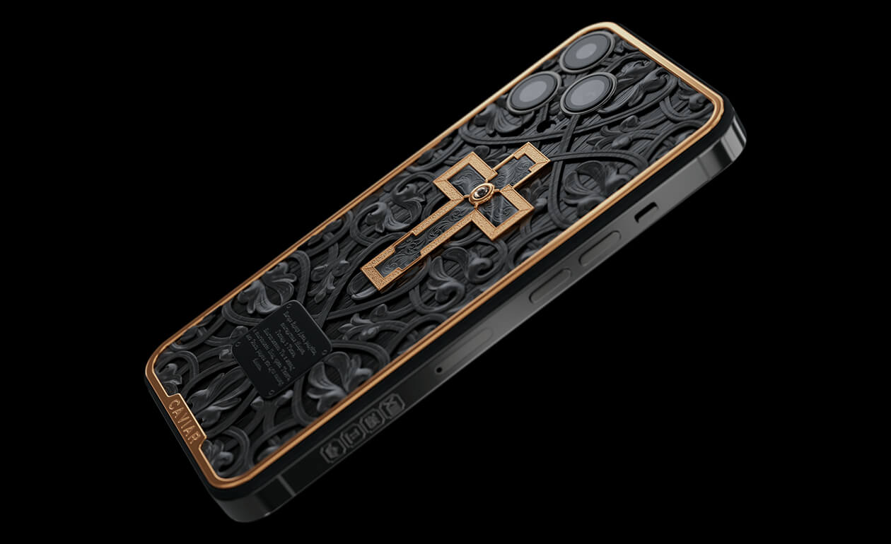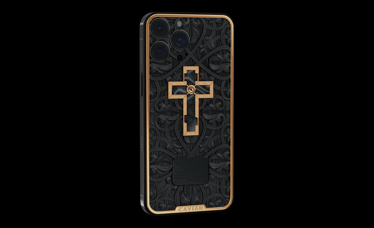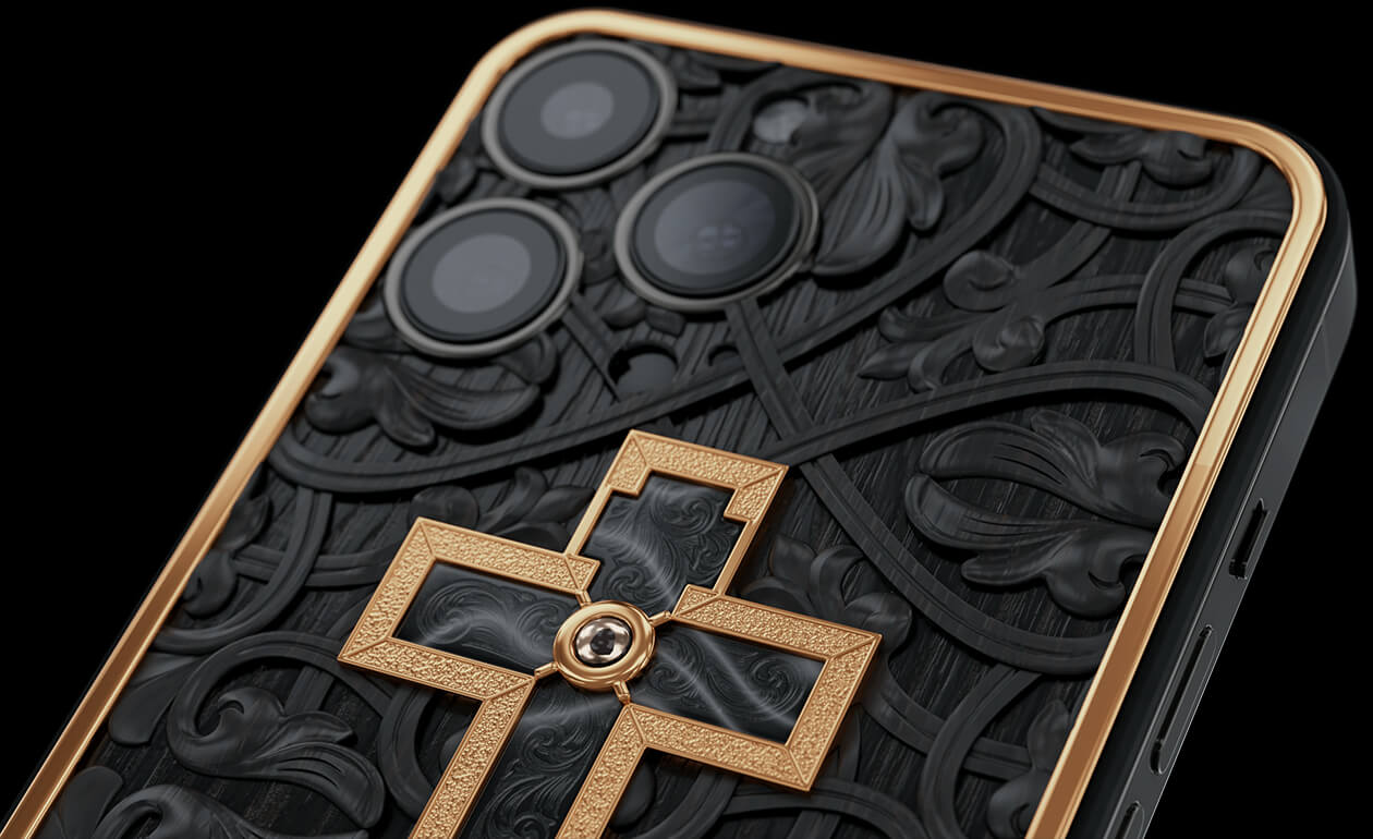 В дизайне прекрасного iPhone 16 Pro Credo Ave Maria от Caviar используются только самые благородные материалы: черный титан с узором в виде объемного 3д-панно, ювелирная сталь с двойным золотым покрытием по технологии Double Electroplated (24K, 7mk).