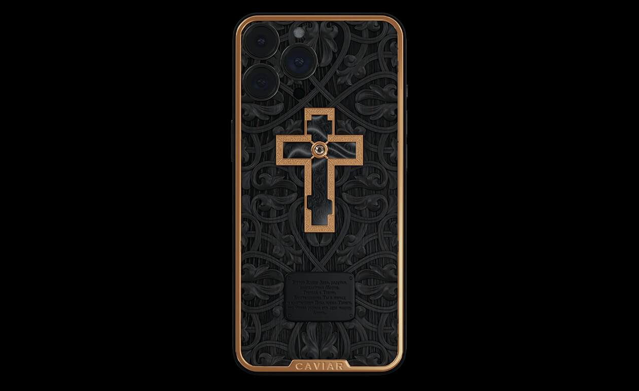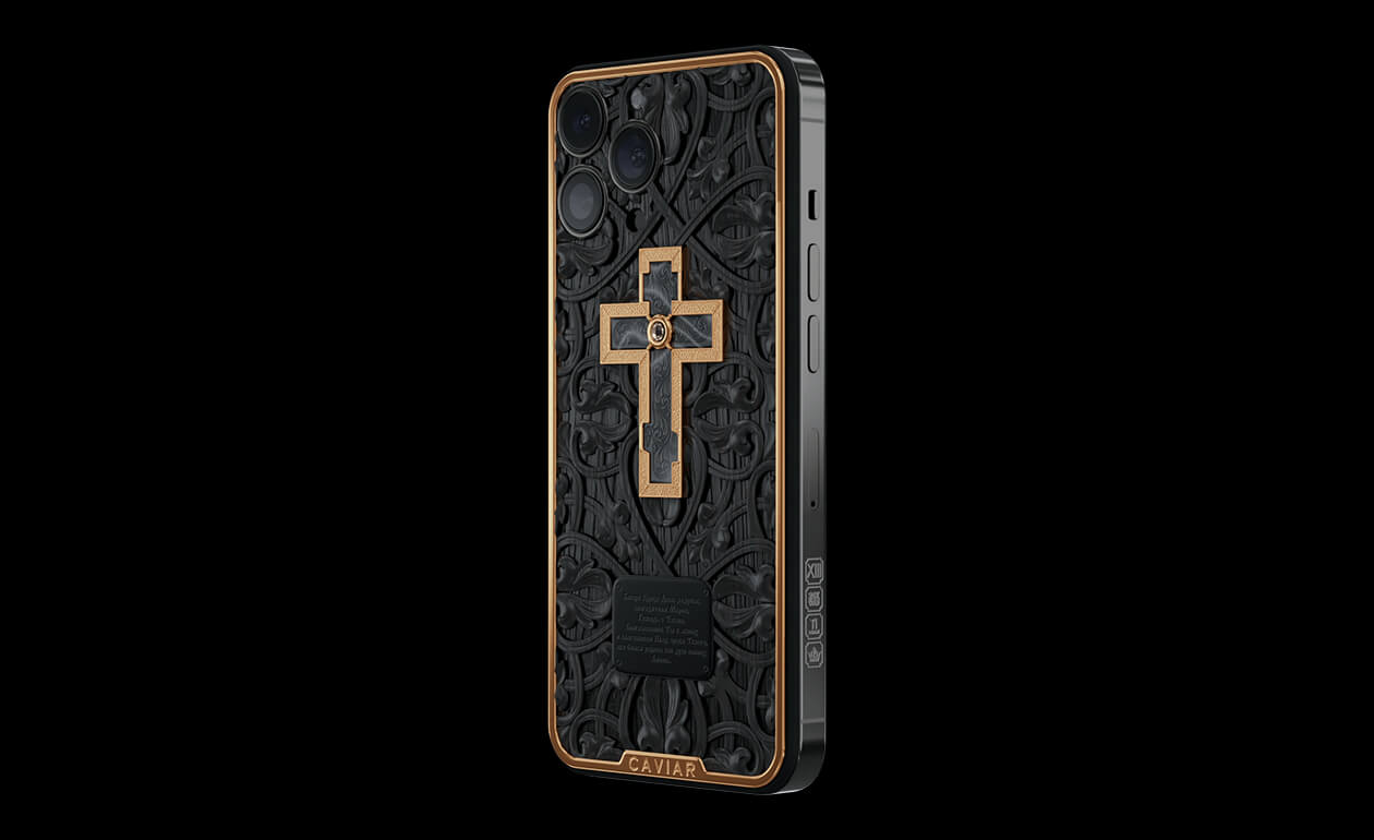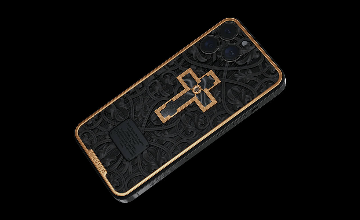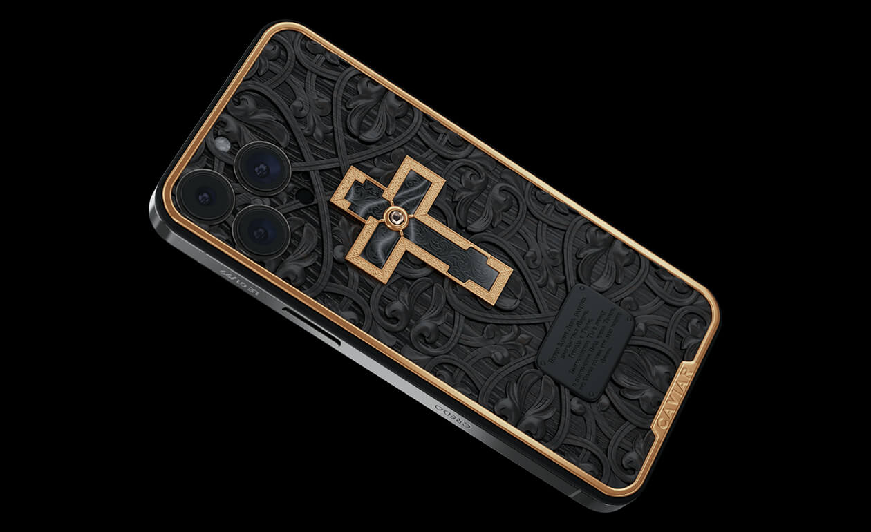 В дизайне прекрасного iPhone 16 Pro Credo Ave Maria от Caviar используются только самые благородные материалы: черный титан с узором в виде объемного 3д-панно, ювелирная сталь с двойным золотым покрытием по технологии Double Electroplated (24K, 7mk).