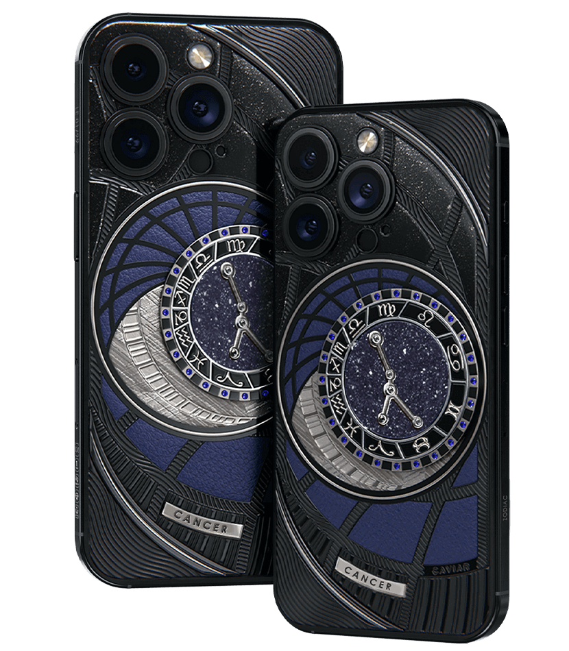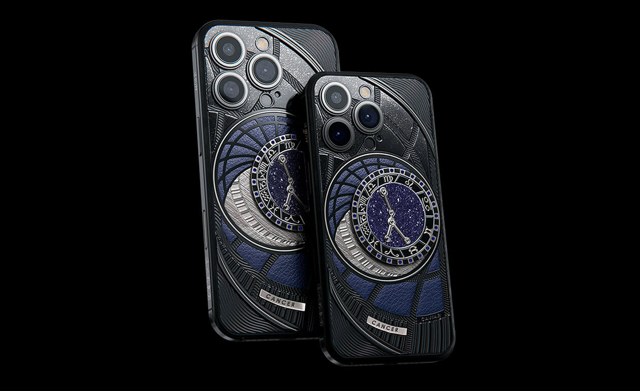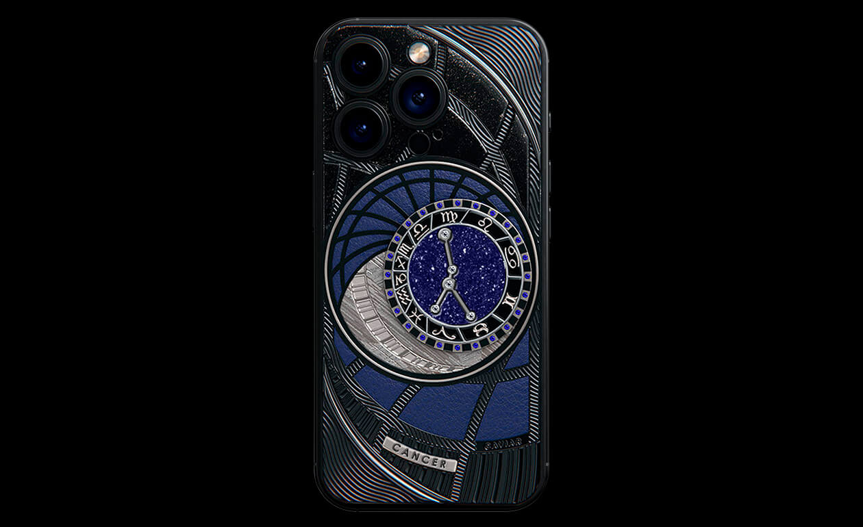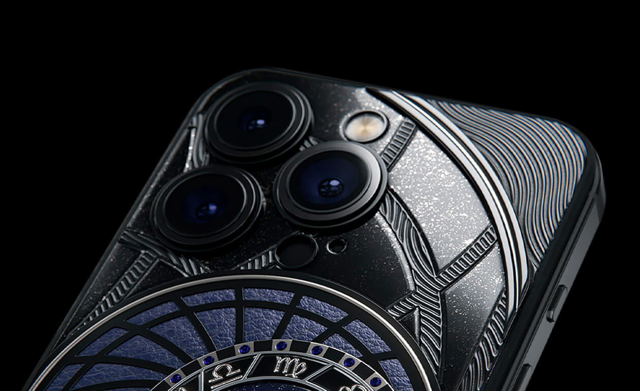 На корпусе смартфона есть небесный свод с вашими звездами. Это панно из 24 сапфиров, созданное на черном титане с PVD-покрытием. Мы подчеркнули сияние сапфировой россыпи с помощью синего искусственного камня и завершили композицию фрагментом метеорита на телячьей коже в ярком оттенке индиго.
