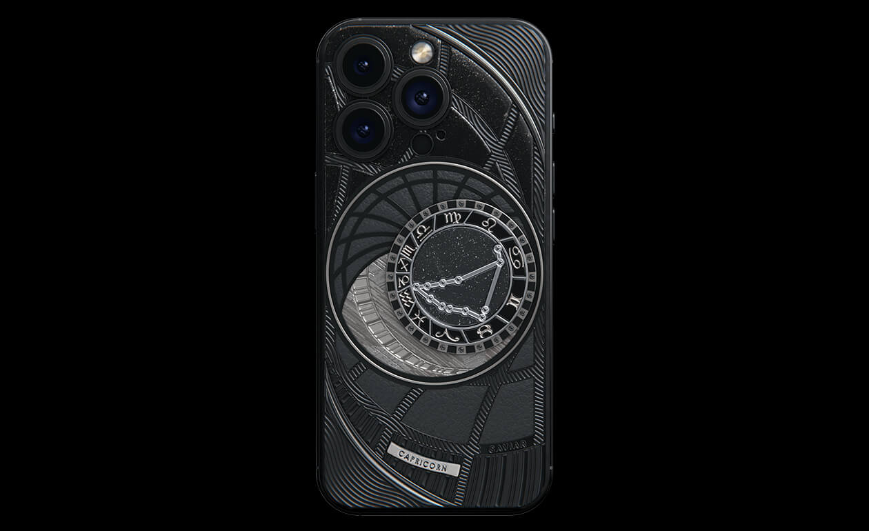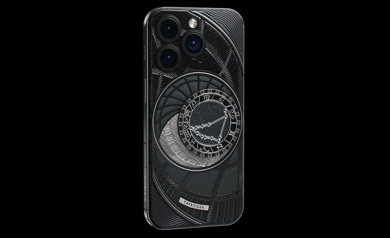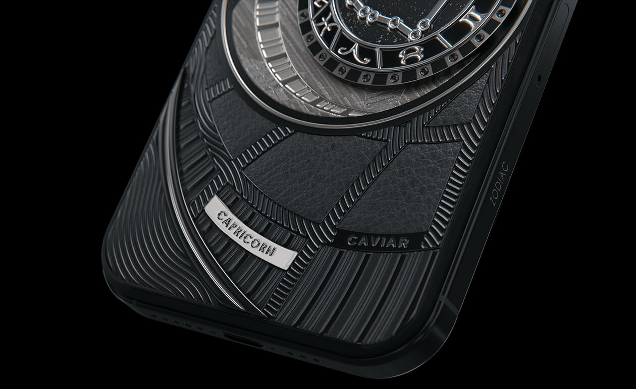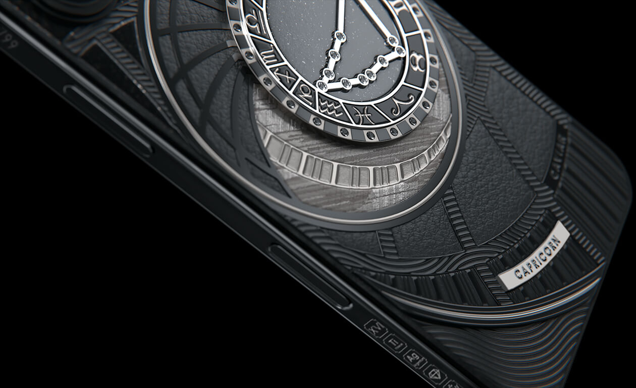 Козероги, сегодня мы представляем вам Capricorn. На корпусе смартфона есть небесный свод с вашими звездами. Это панно из 24 черных циркониев, созданное на титане с PVD-покрытием. Мы подчеркнули сияние россыпи черных бриллиантов с помощью композита с узором звезд и завершили композицию фрагментом метеорита на телячьей коже классического черного цвета.