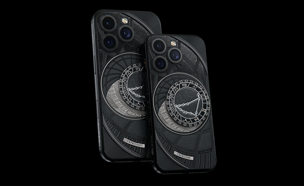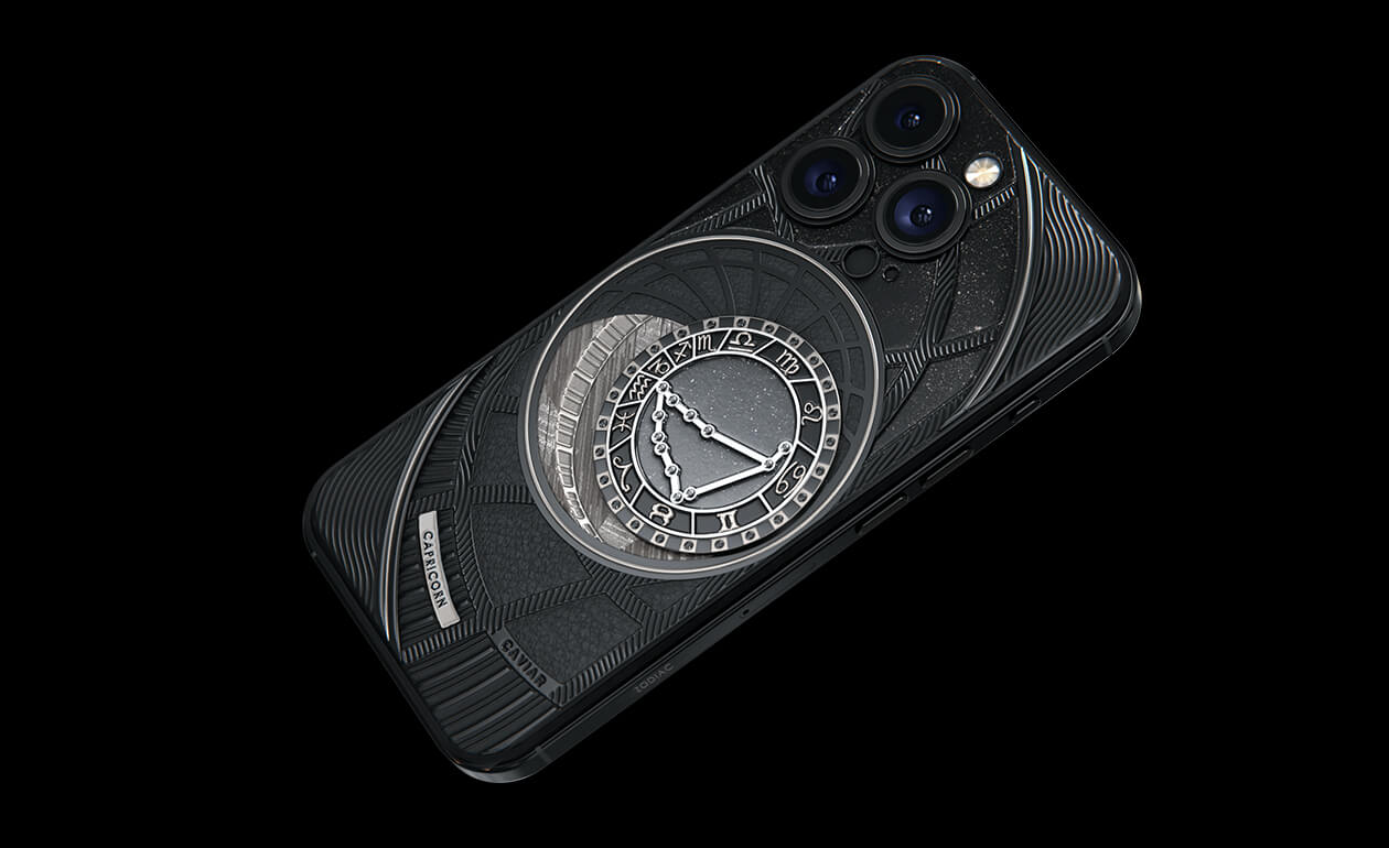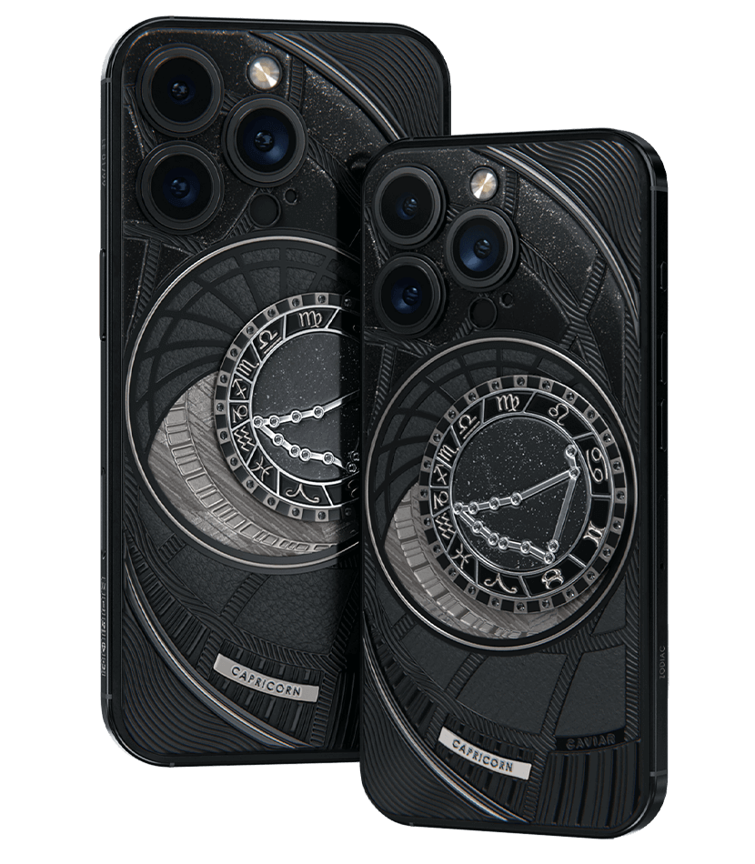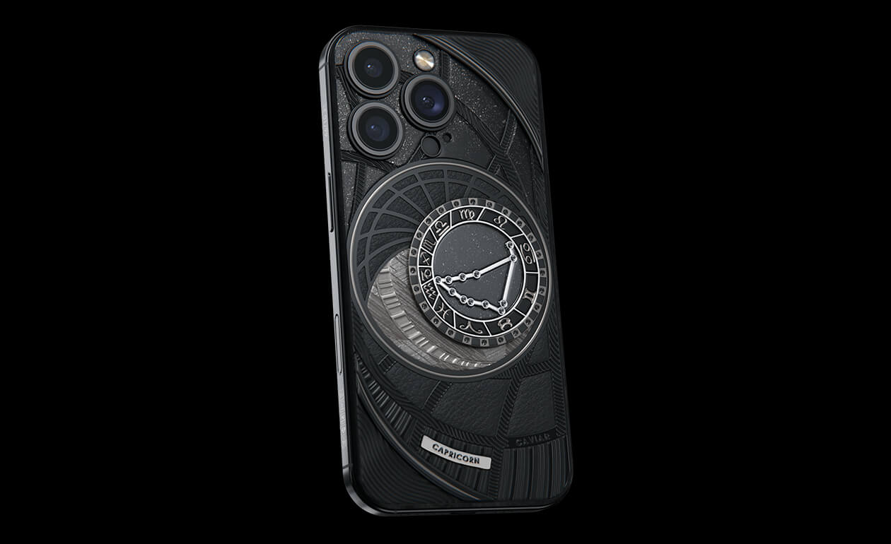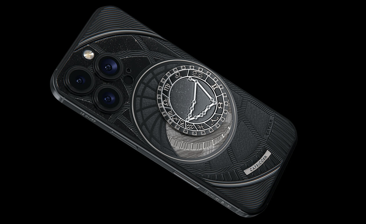 Козероги, сегодня мы представляем вам Capricorn. На корпусе смартфона есть небесный свод с вашими звездами. Это панно из 24 черных циркониев, созданное на титане с PVD-покрытием. Мы подчеркнули сияние россыпи черных бриллиантов с помощью композита с узором звезд и завершили композицию фрагментом метеорита на телячьей коже классического черного цвета.