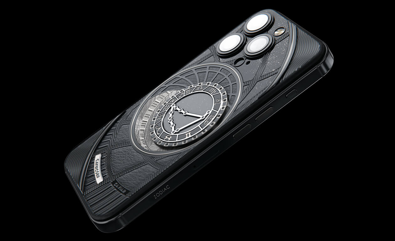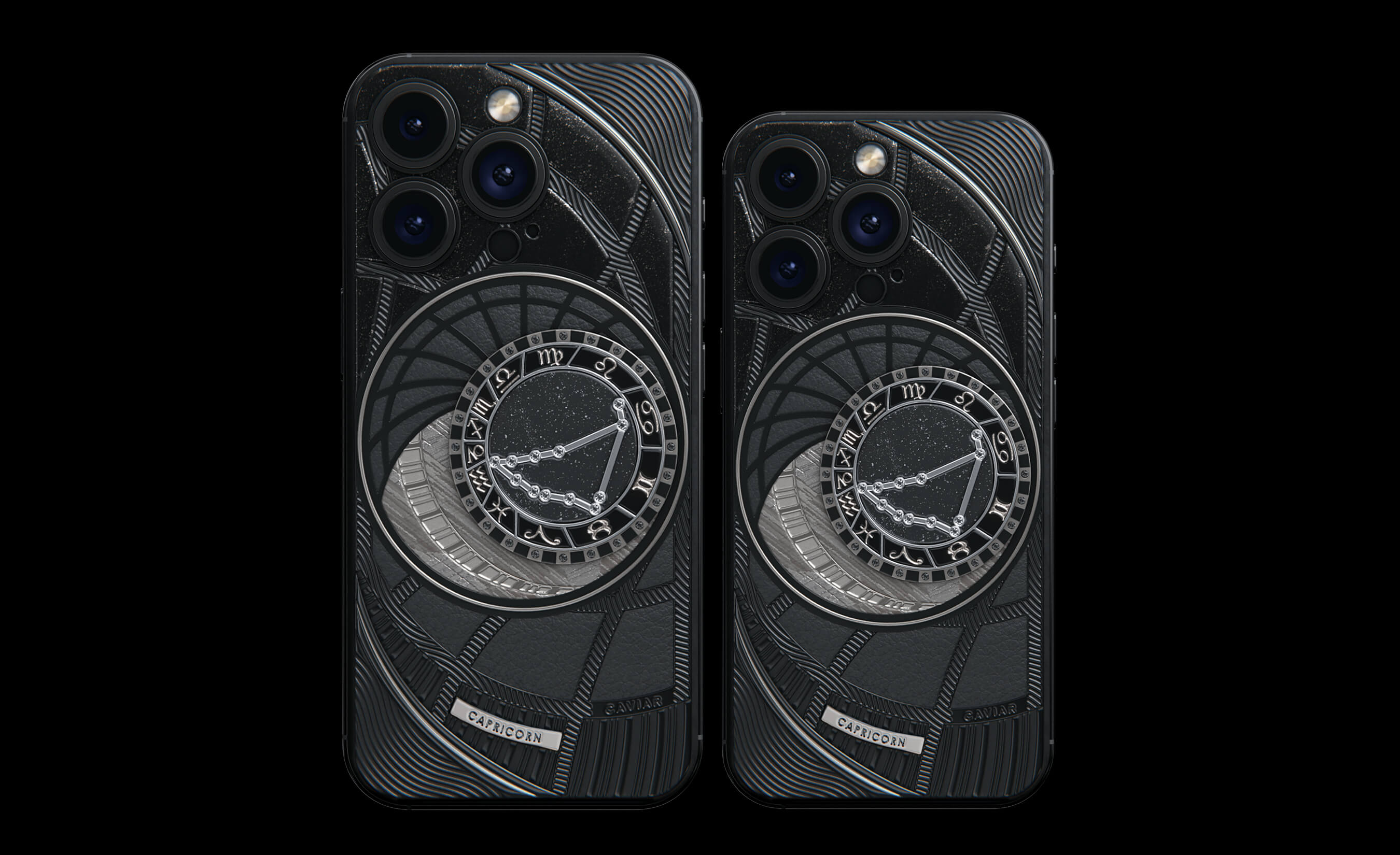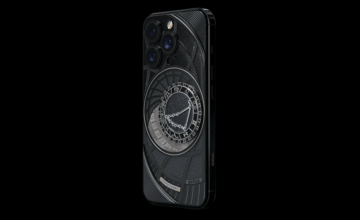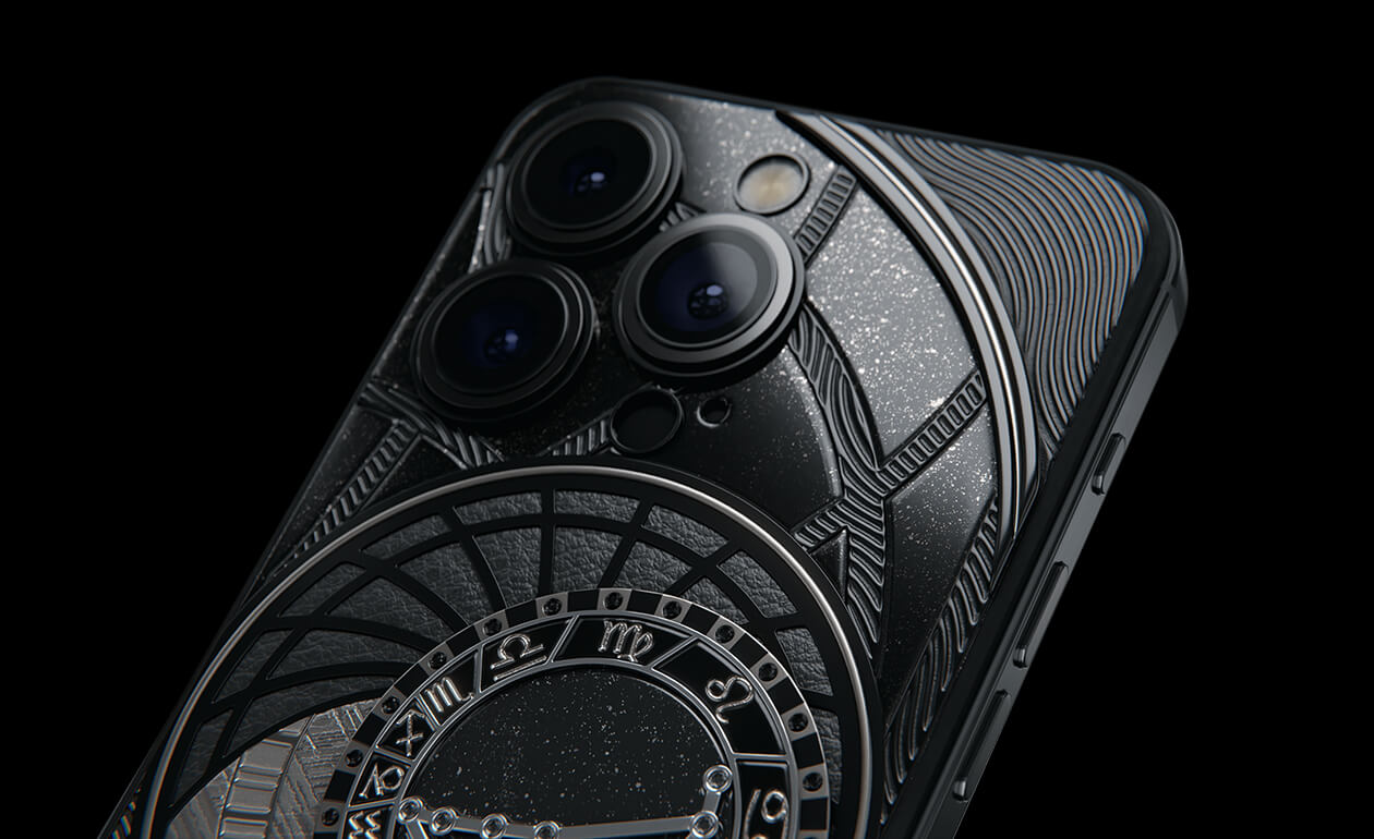 Козероги, сегодня мы представляем вам Capricorn. На корпусе смартфона есть небесный свод с вашими звездами. Это панно из 24 черных циркониев, созданное на титане с PVD-покрытием. Мы подчеркнули сияние россыпи черных бриллиантов с помощью композита с узором звезд и завершили композицию фрагментом метеорита на телячьей коже классического черного цвета.