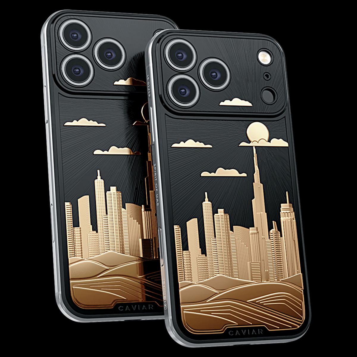 Caviar запечатлел величие ближневосточного чуда на корпусе iPhone: роскошная объемная панорама, покрытая 24-каратным золотом, включает силуэты Бурдж-Халифа, Бурдж-аль-Араб и Палм-Джумейры – символов эксклюзивности и грандиозности. Гравировка передает игру света и тени, создавая эффект глубины и движения.