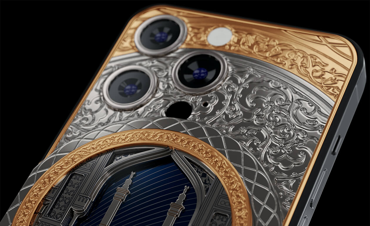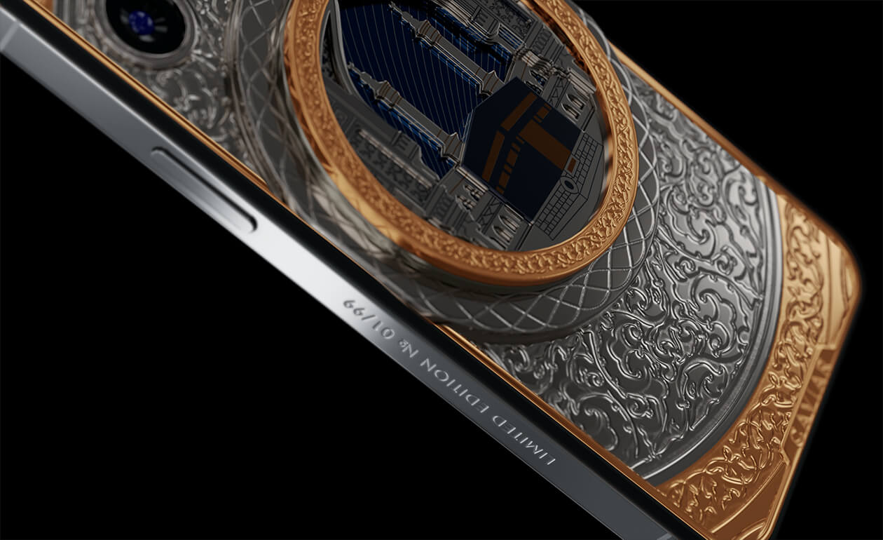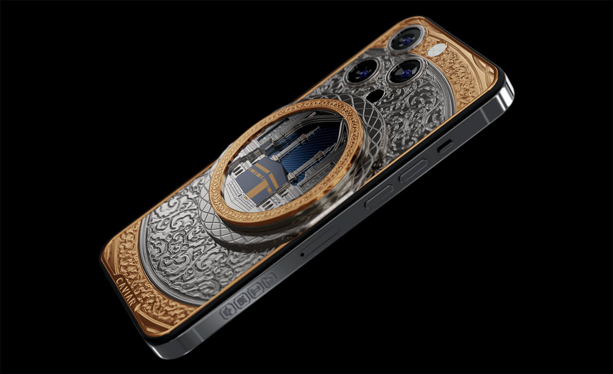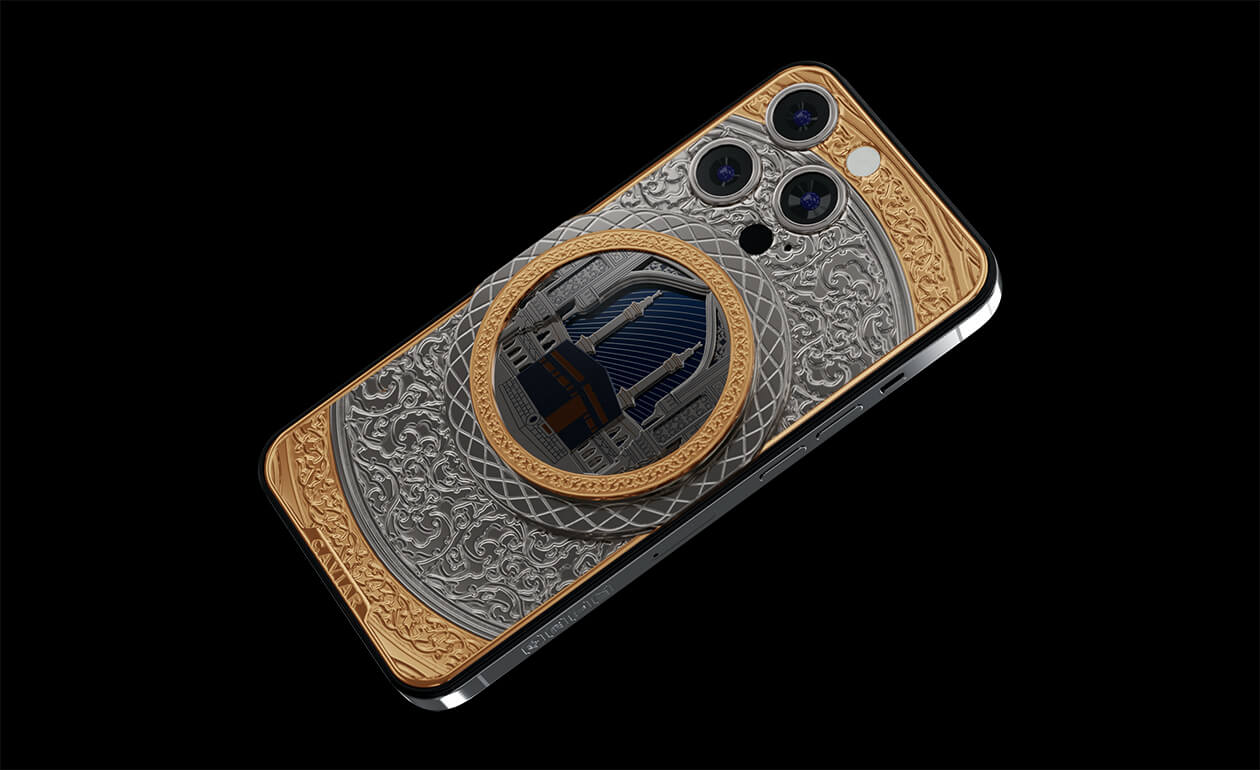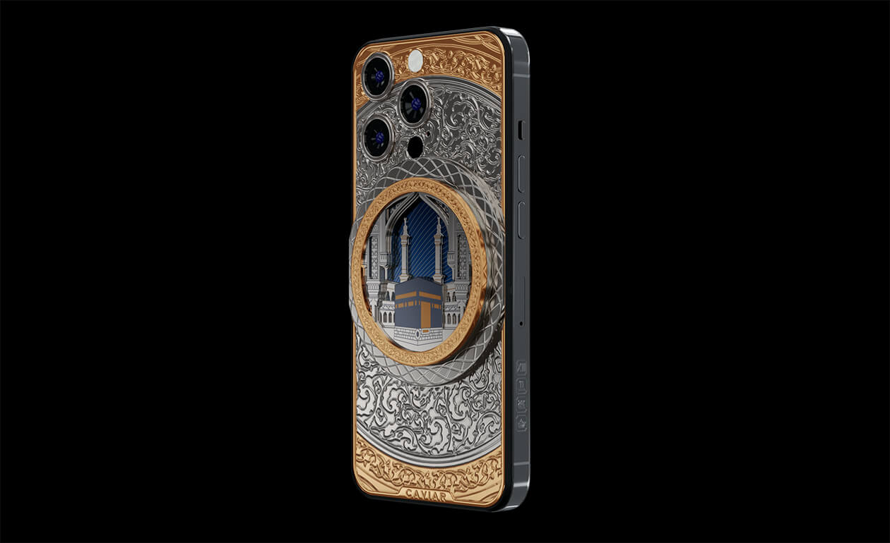 В самом центре телефона – многослойная 3D композиция под ударопрочным стеклом – ансамбль из минаретов и главная мусульманская святыня – Кааба. Мусульмане верят, что пророк Мухаммед один раз поцеловал камень, поэтому во время своей поездки в Мекку они пытаются поцеловать Черный камень.