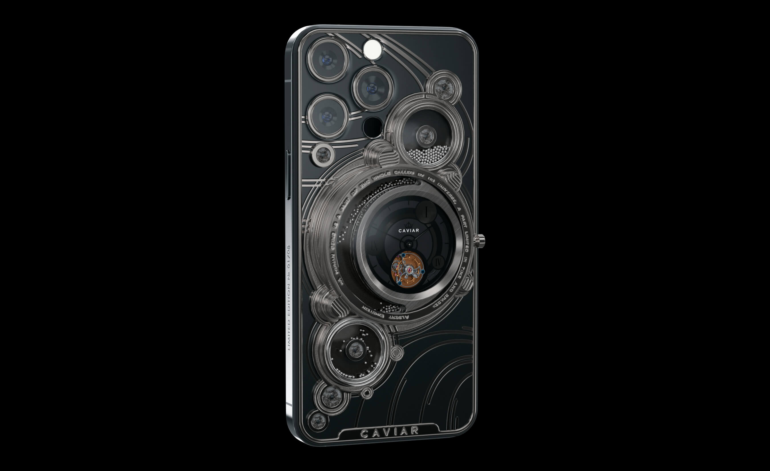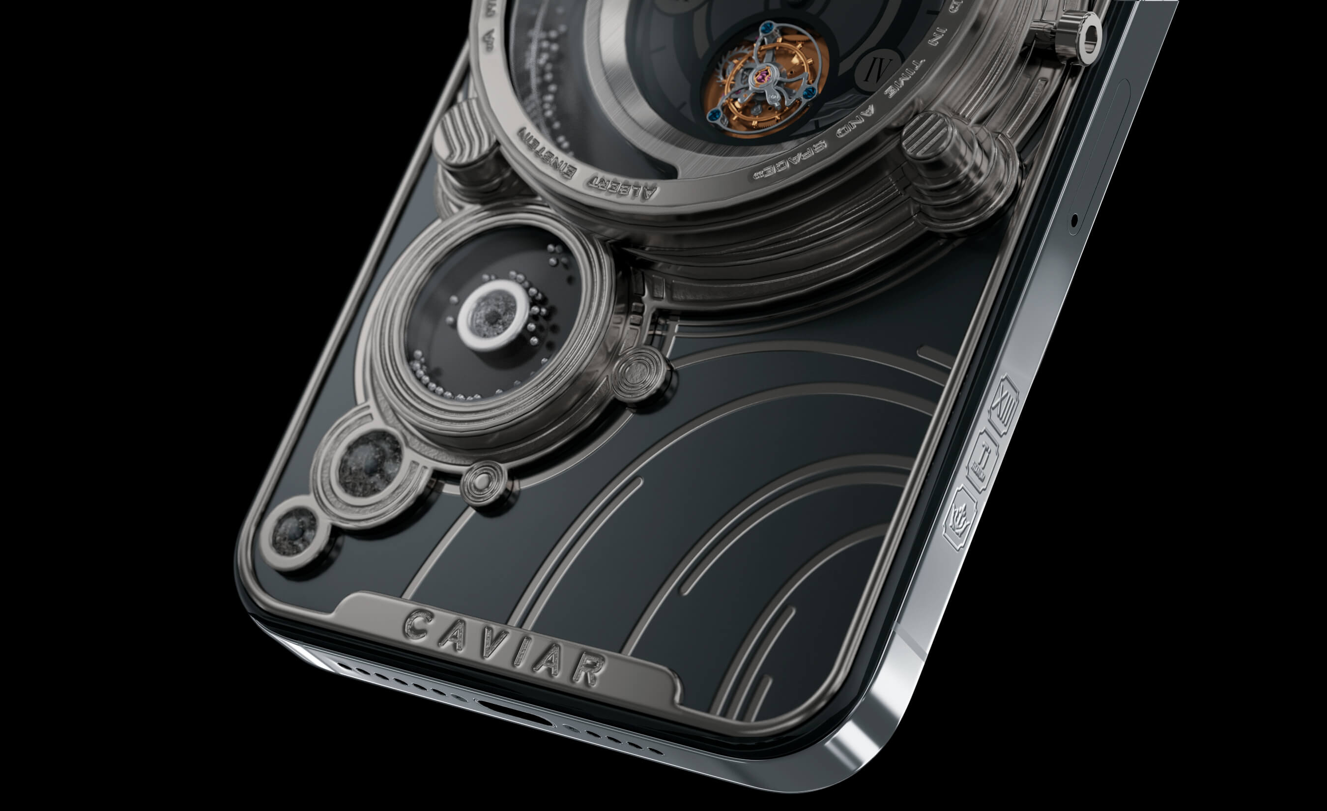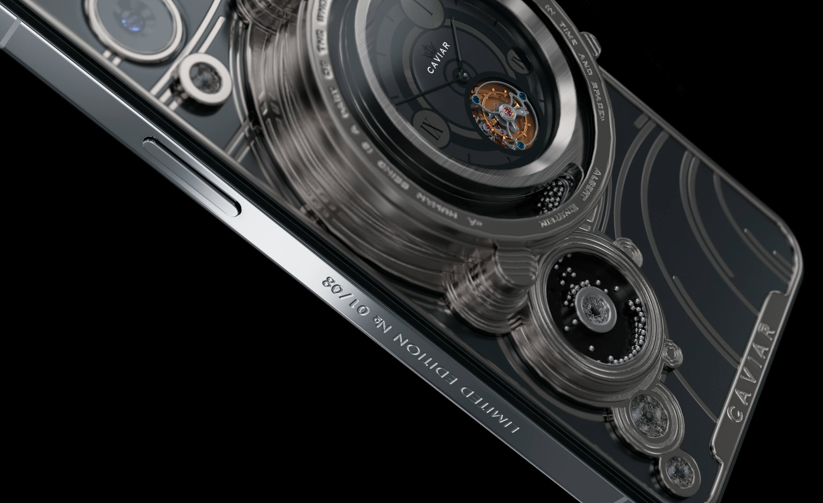 Землю символизируют встроенные в корпус смартфона механические часы с турбийоном. Этот выбор не случаен - турбийон нивелирует влияние гравитации на часовой механизм, что делает ход более точным. Так и человечество - неизвестно, сколько времени отмерено каждому из нас в сложной эпохе покорения космоса, но шестерни уже запущены и стрелка часов отсчитывает время, за которое человечество покорит космос.