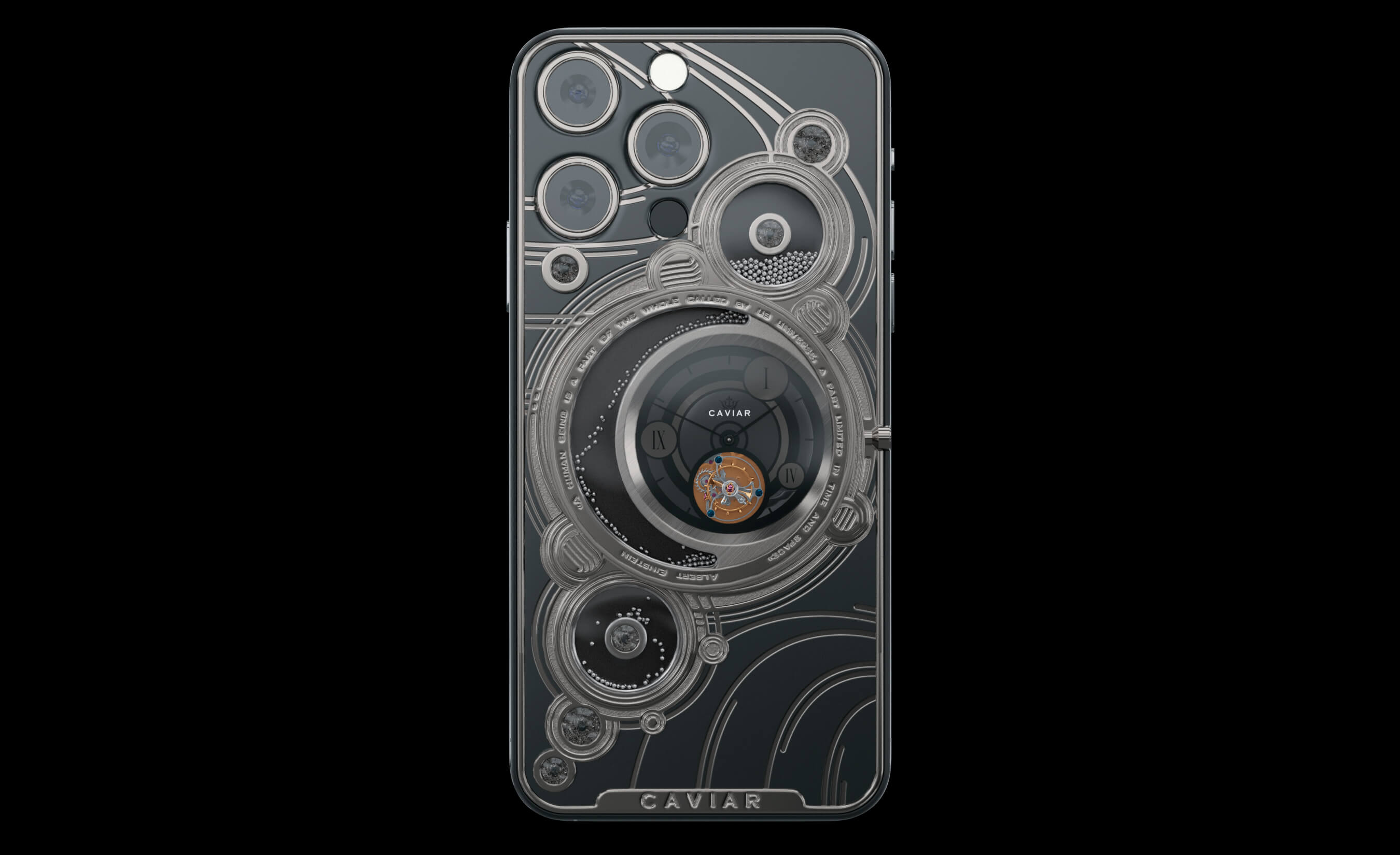 Caviar iPhone 16 Pro Parade of the Planets Titanium - смартфон, на создание которого художников бренда вдохновила сама Солнечная система. На корпусе аксессуара - стилистические изображения планет: в центре - Земля со своим спутником, Луной; наверху - Меркурий и Марс со спутниками Фобосом и Деймосом; внизу - Венера, Юпитер и Сатурн. В корпус встроены уникальные фрагменты - метеориты, упавшие на Землю с Луны и Марса.