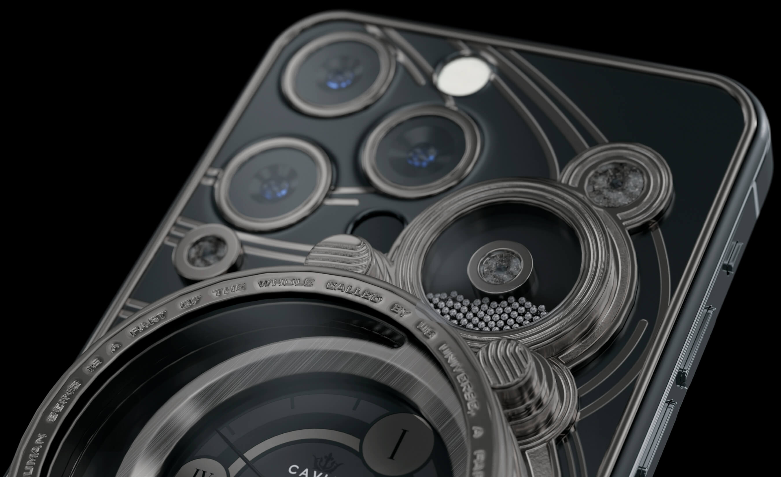Заднюю часть корпуса украшает сложносоставной механизм - уникальные трехуровневые песочные часы с серебристым песком. Если Вы немного потрясете смартфон, увидите завораживающее течение песка от одной планеты к другой. Так человеческие мысли, стремления и исследования, курсируют между небесными телами, открывая новые неизведанные космические истины.