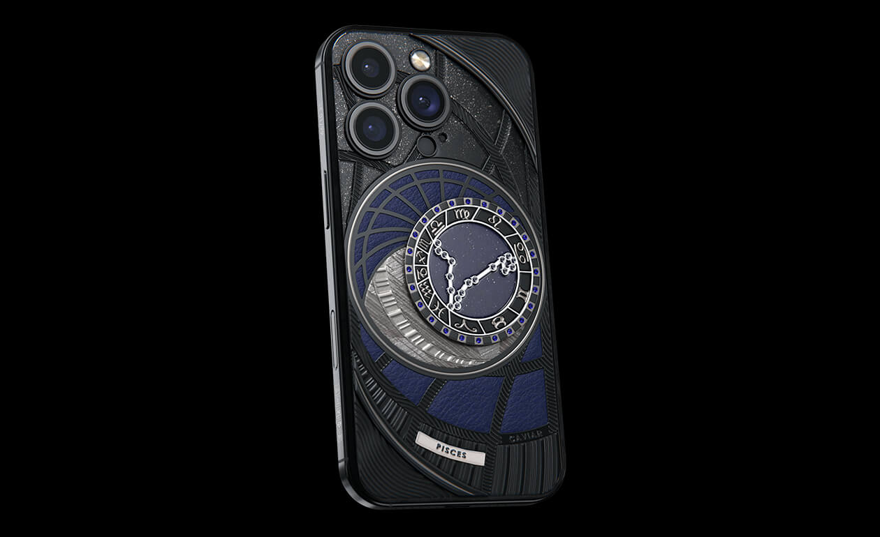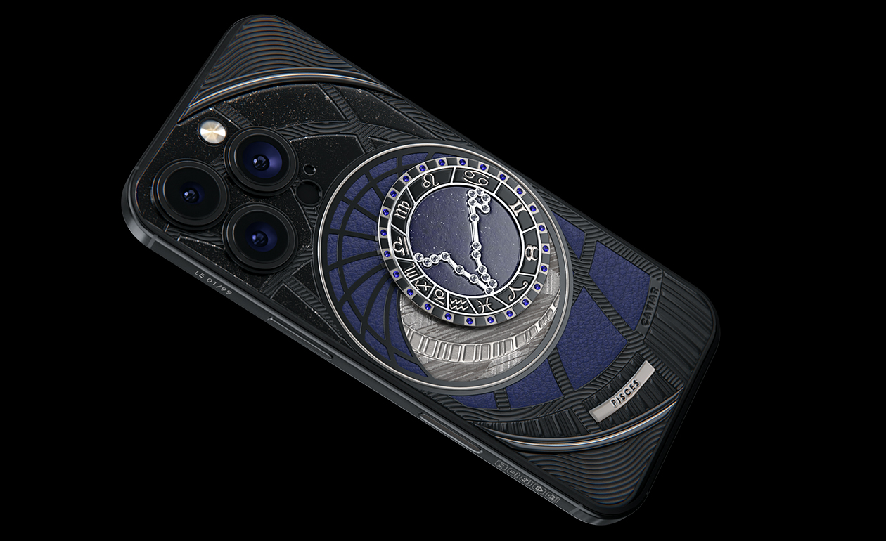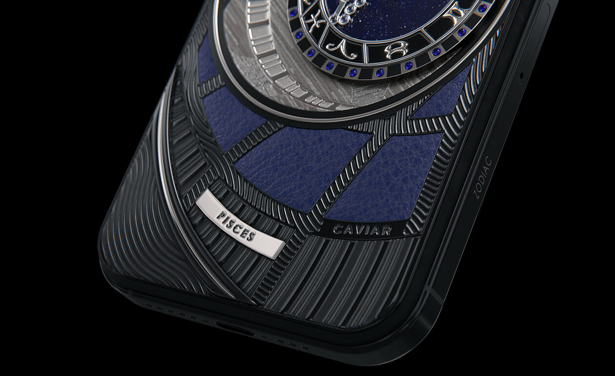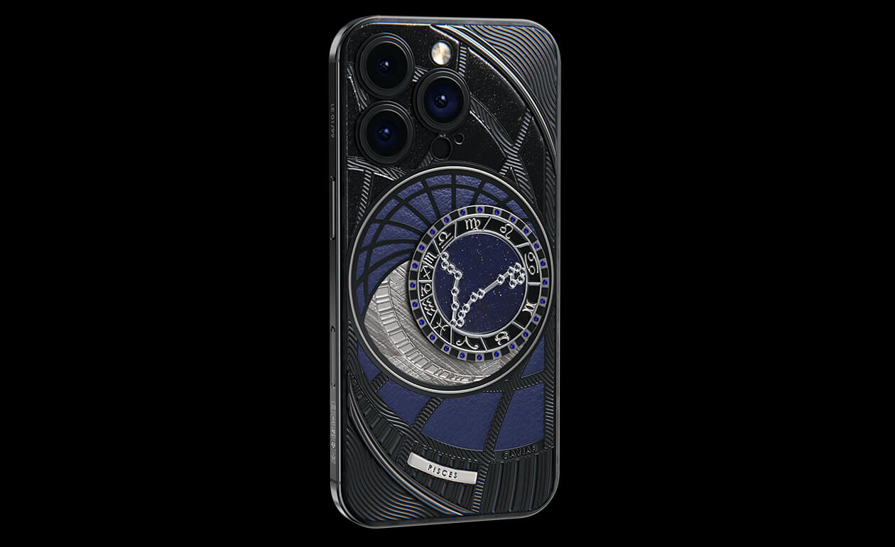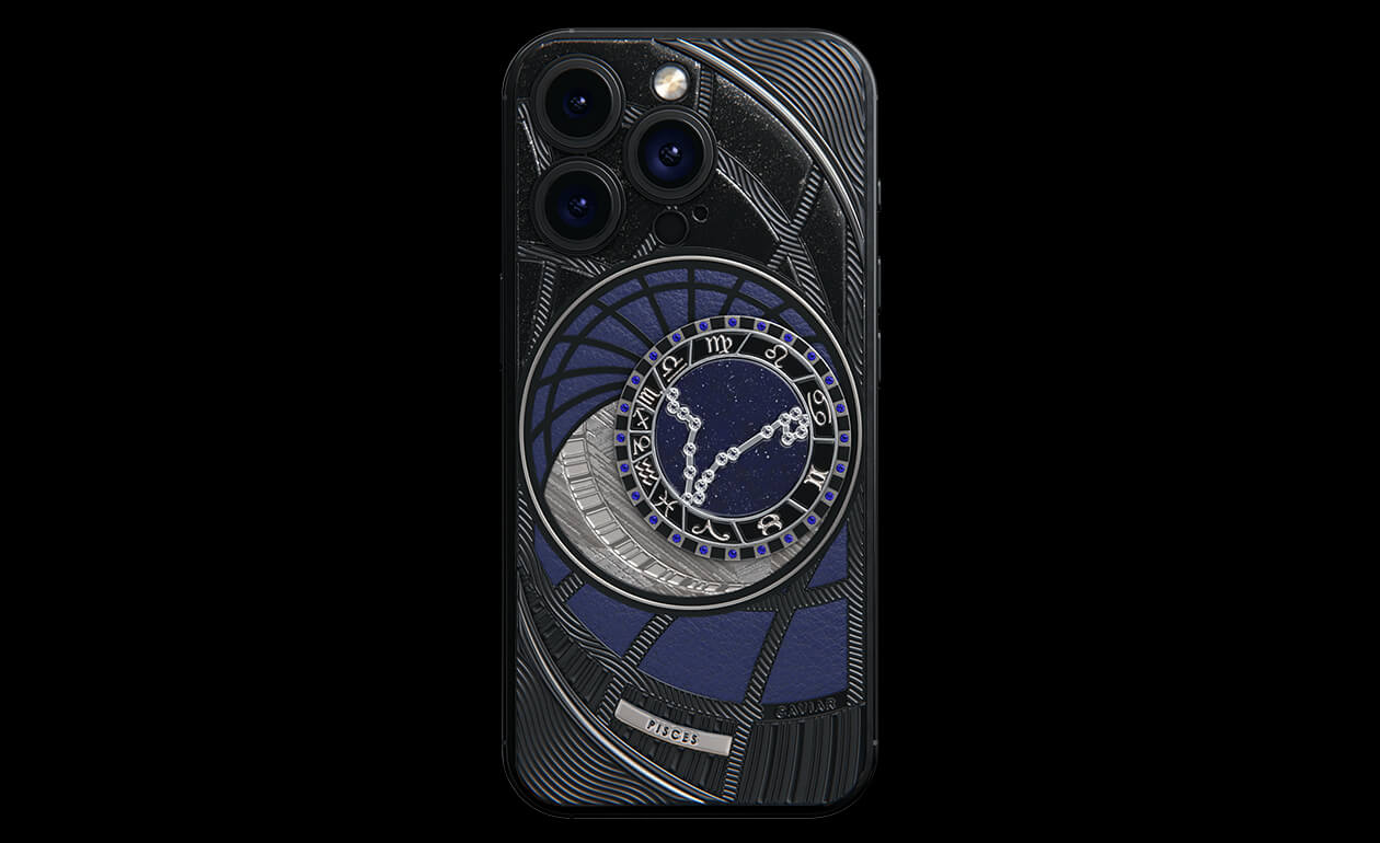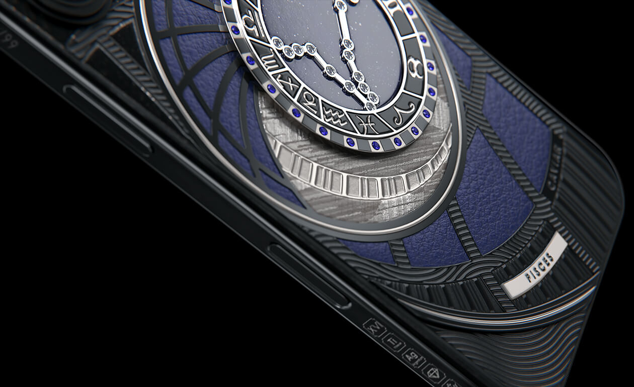 Рыбы, сегодня мы представляем вам Pisces. На корпусе смартфона есть небесный свод с вашими звездами. Это панно из 24 сапфиров, созданное на черном титане с PVD-покрытием. Мы подчеркнули сияние сапфировой россыпи с помощью синего искусственного камня и завершили композицию фрагментом метеорита на телячьей коже в ярком оттенке индиго.