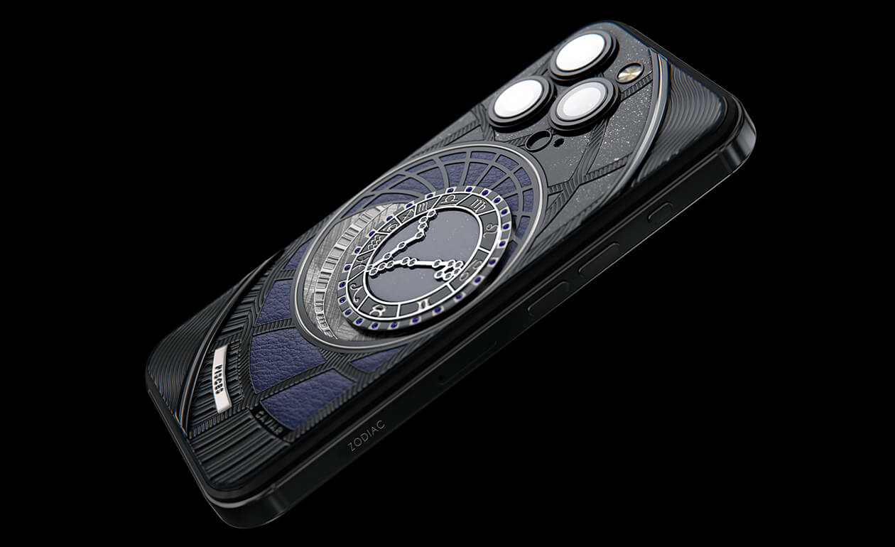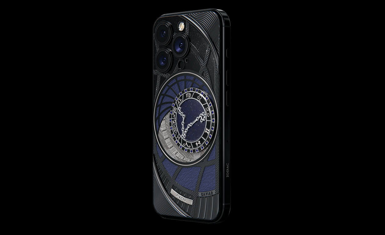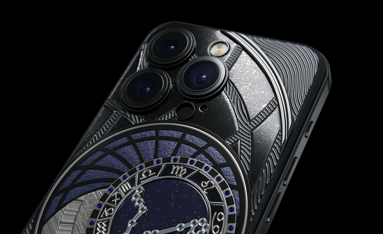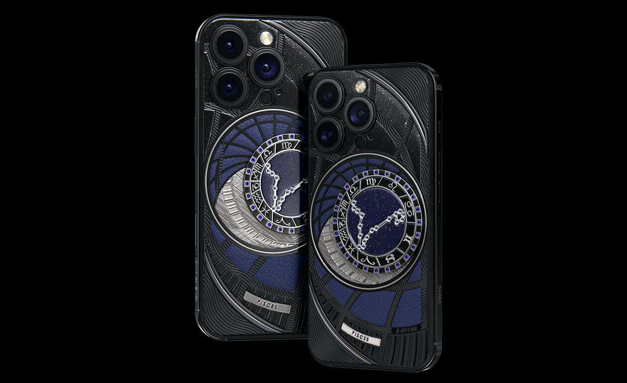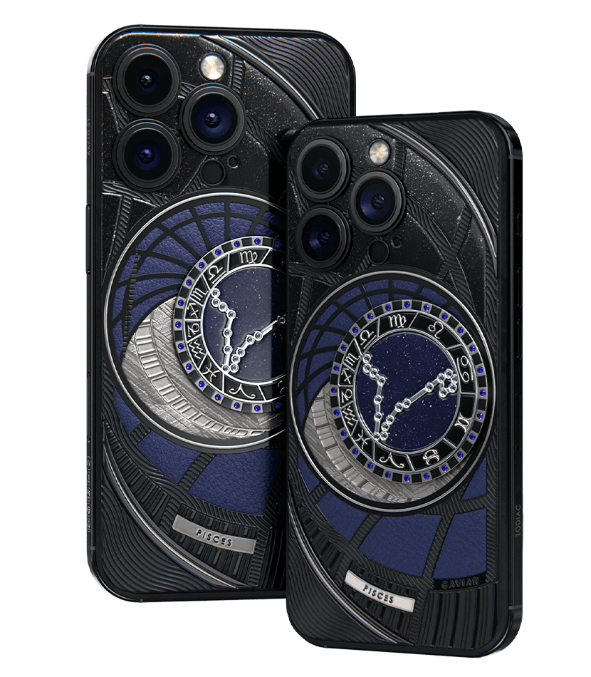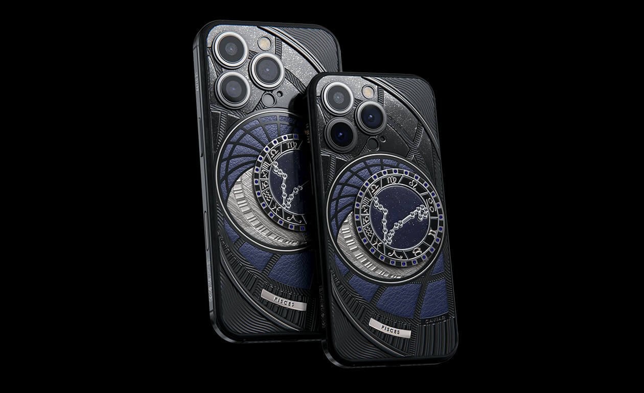 Рыбы, сегодня мы представляем вам Pisces. На корпусе смартфона есть небесный свод с вашими звездами. Это панно из 24 сапфиров, созданное на черном титане с PVD-покрытием. Мы подчеркнули сияние сапфировой россыпи с помощью синего искусственного камня и завершили композицию фрагментом метеорита на телячьей коже в ярком оттенке индиго.