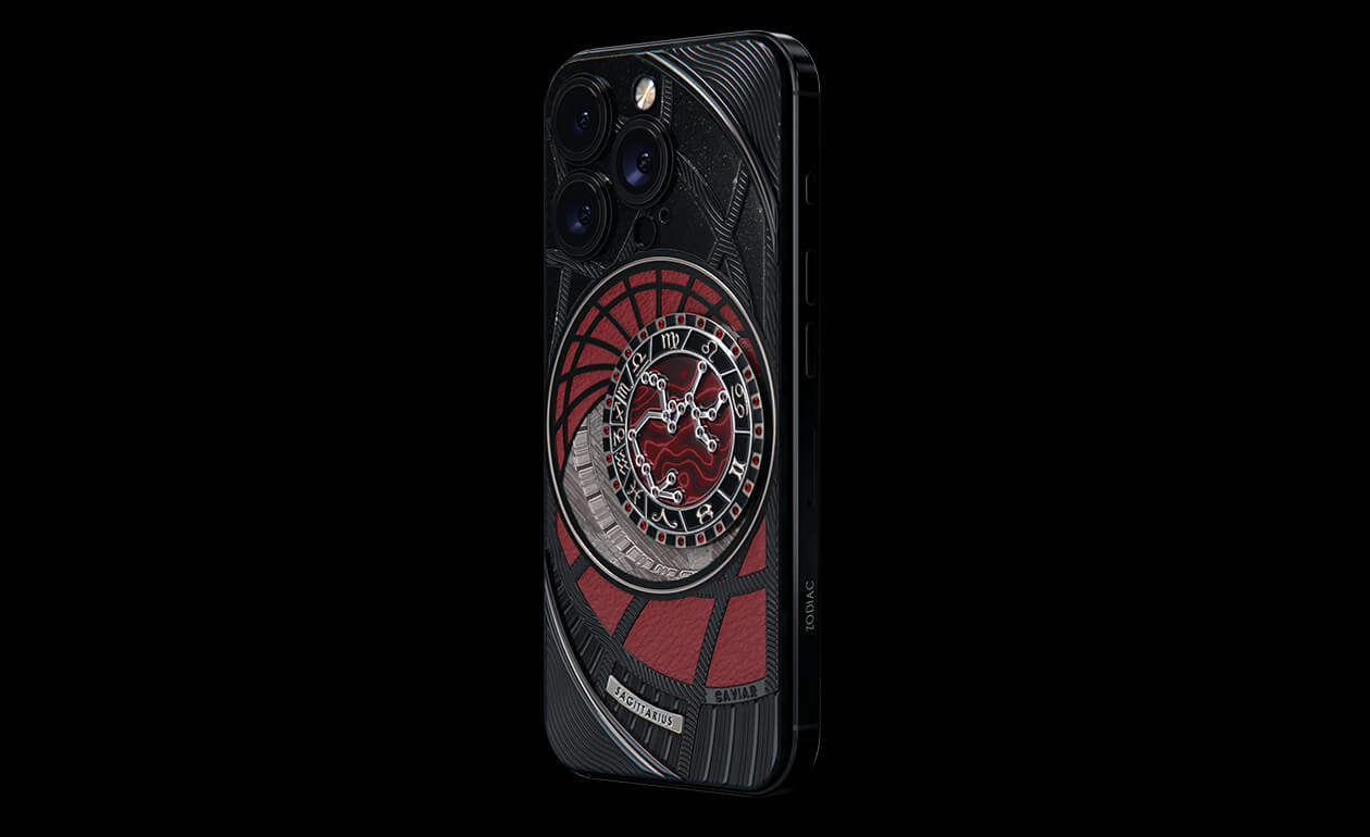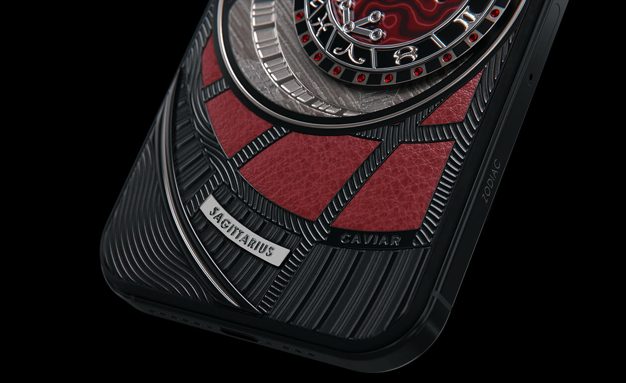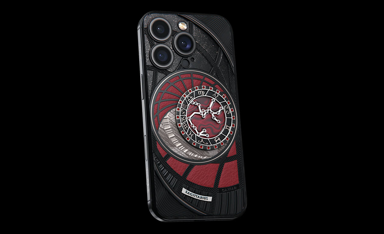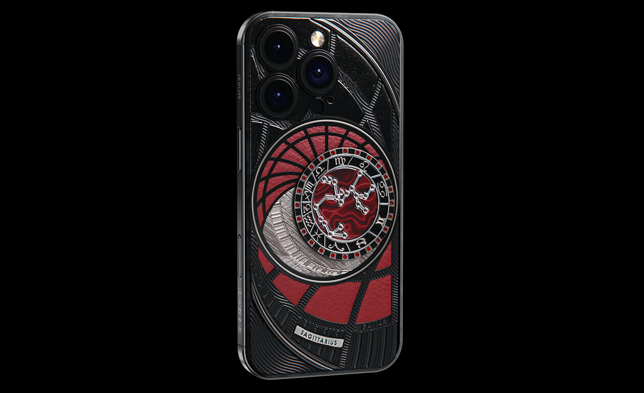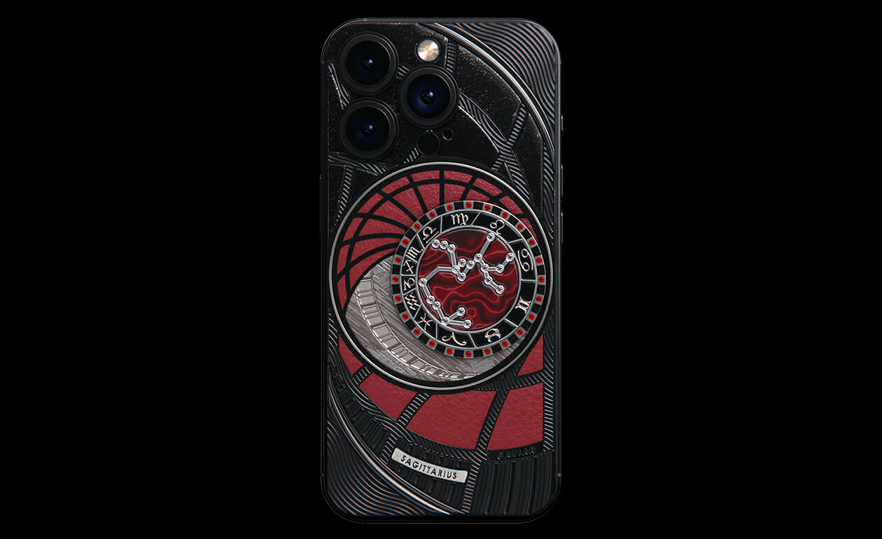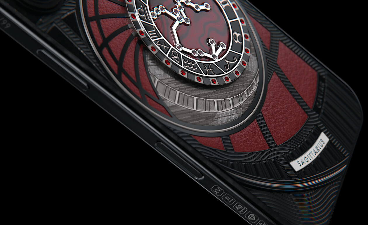 Стрельцы, сегодня мы представляем вам Sagitarius. На корпусе смартфона есть небесный свод с вашими звездами. Это панно из 24 рубинов, созданное на черном титане с PVD-покрытием. Мы подчеркнули сияние рубиновой россыпи с помощью пластины из красного композита и завершили композицию фрагментом метеорита на телячьей коже в ярком карминовом оттенке.