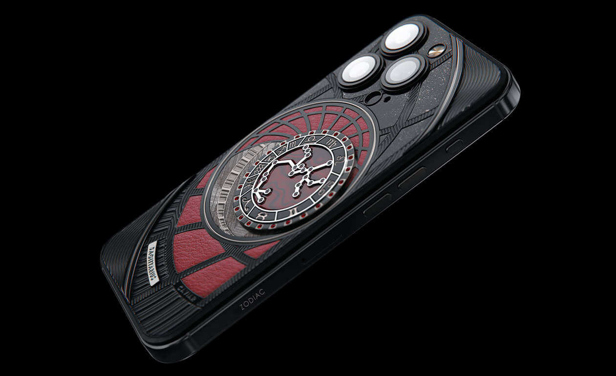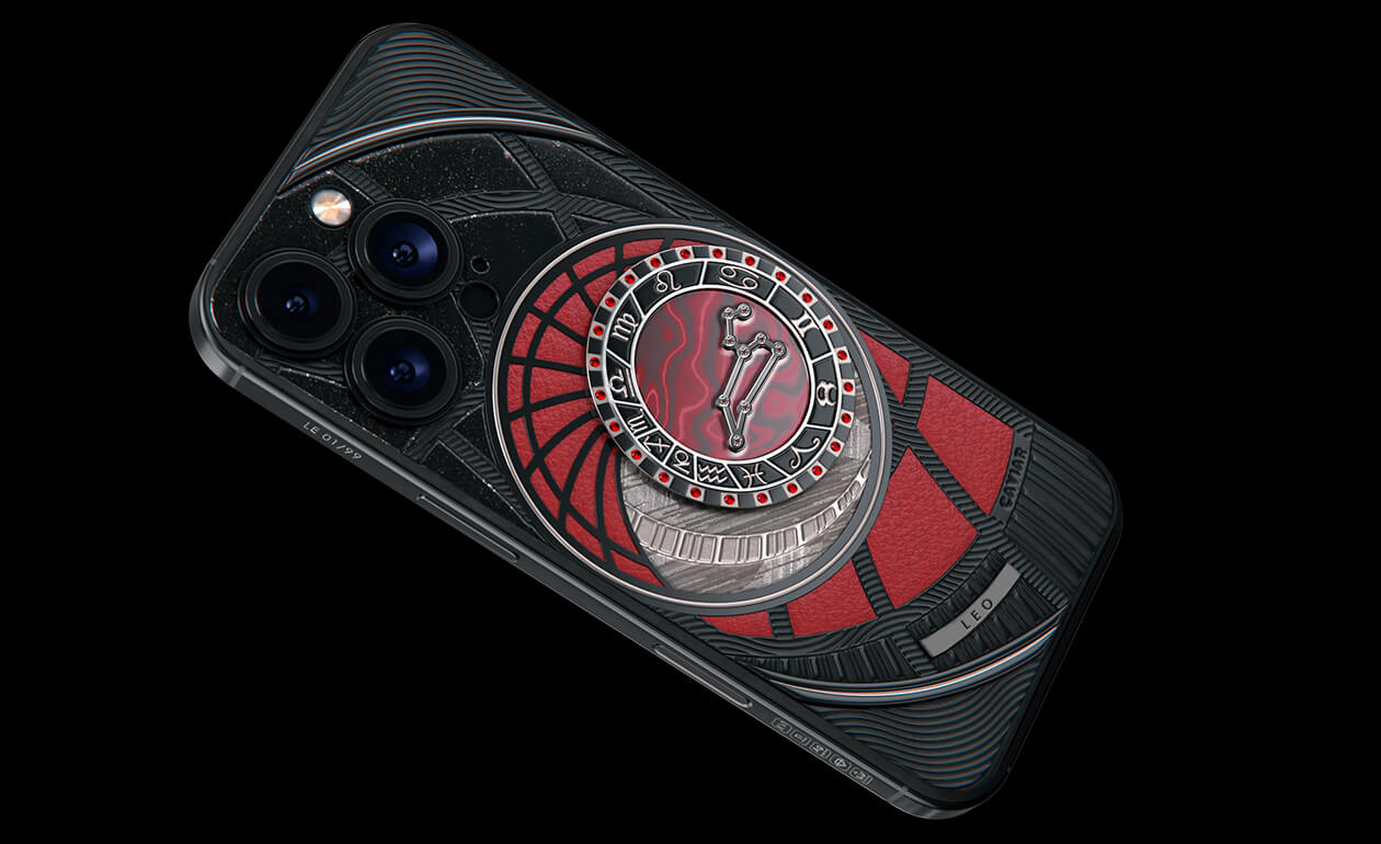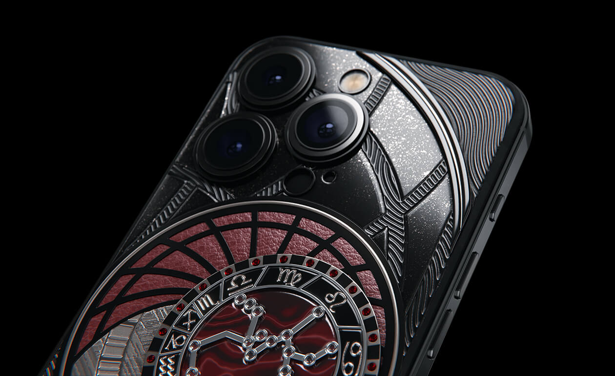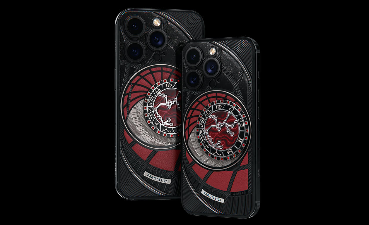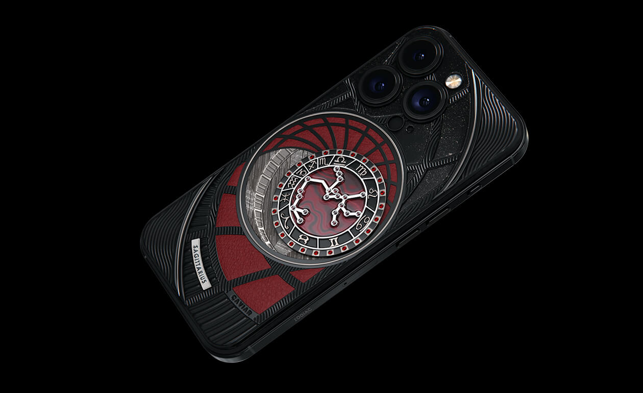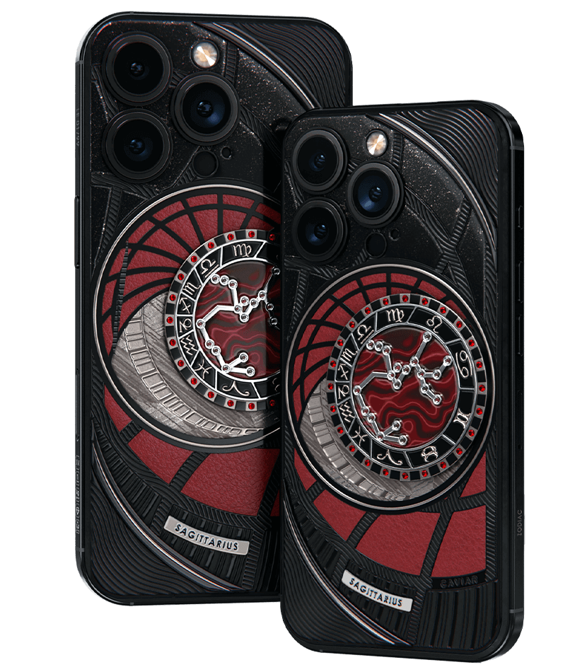 Стрельцы, сегодня мы представляем вам Sagitarius. На корпусе смартфона есть небесный свод с вашими звездами. Это панно из 24 рубинов, созданное на черном титане с PVD-покрытием. Мы подчеркнули сияние рубиновой россыпи с помощью пластины из красного композита и завершили композицию фрагментом метеорита на телячьей коже в ярком карминовом оттенке.