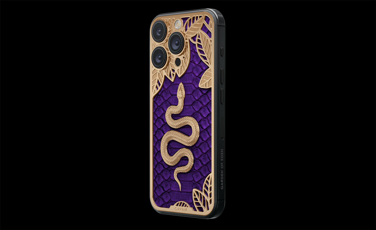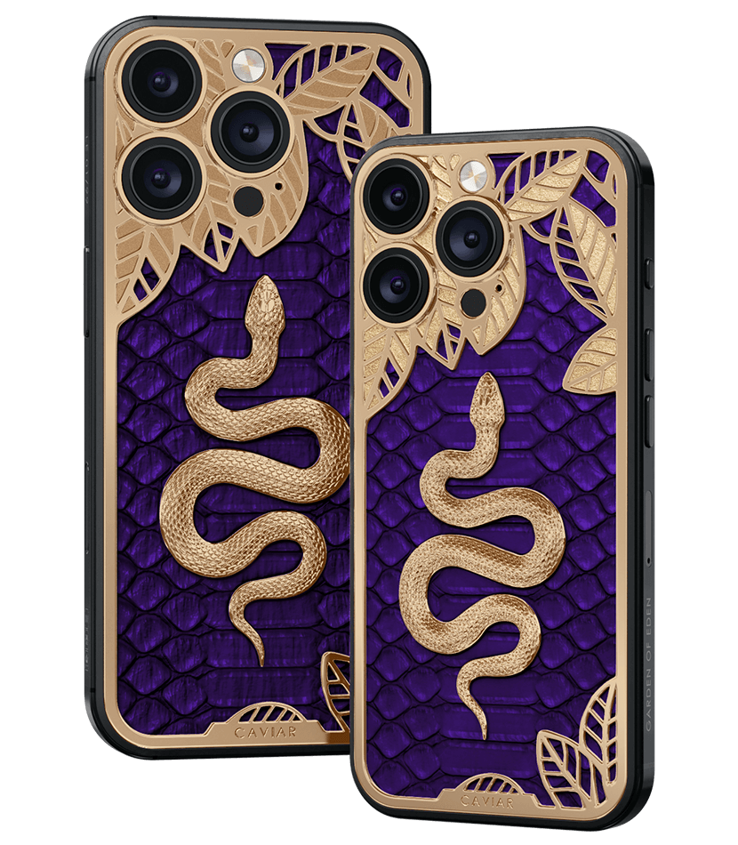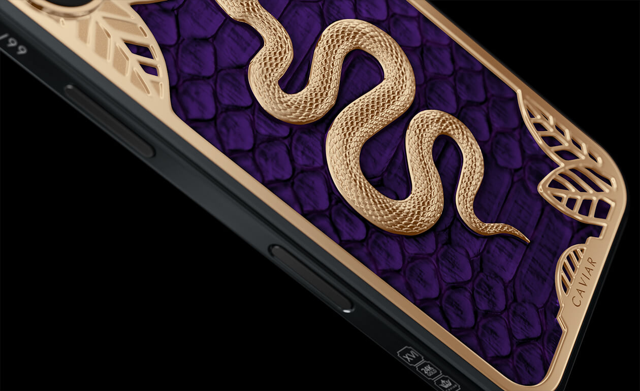 Изящная змейка от Caviar покрыта чистейшим золотом 24К. В контрасте с фиолетовой кожей питона кажется, что она сверкает, устроившись среди позолоченных листьев райского сада.