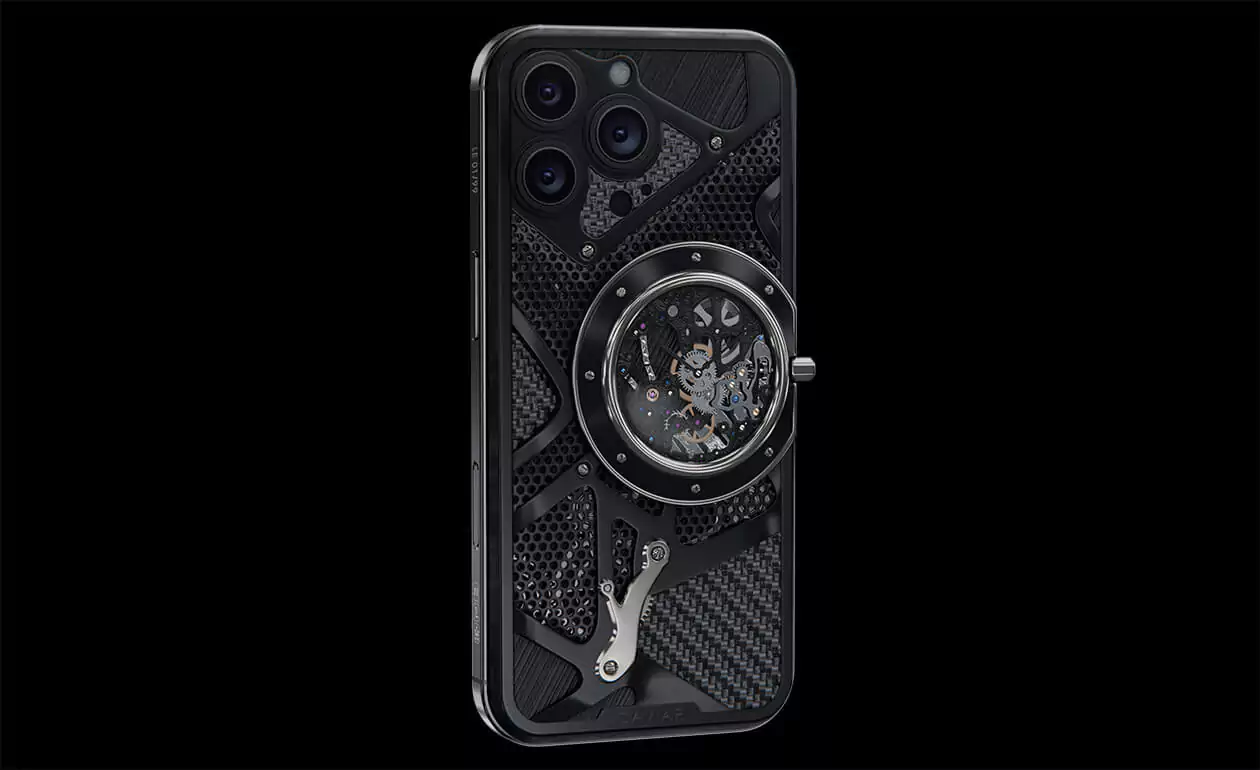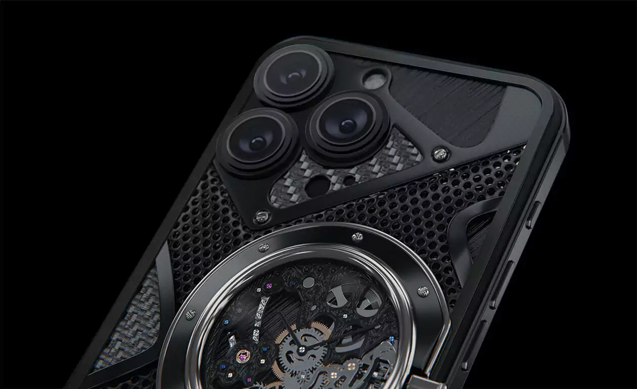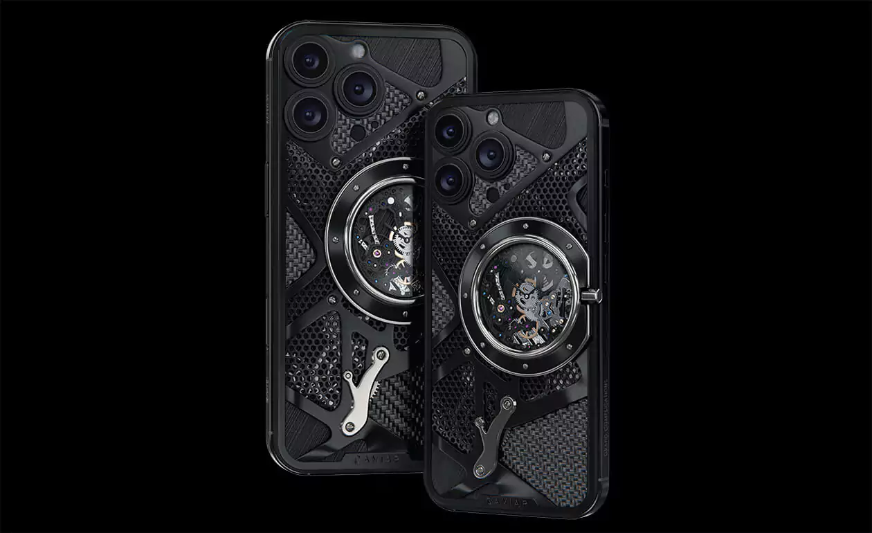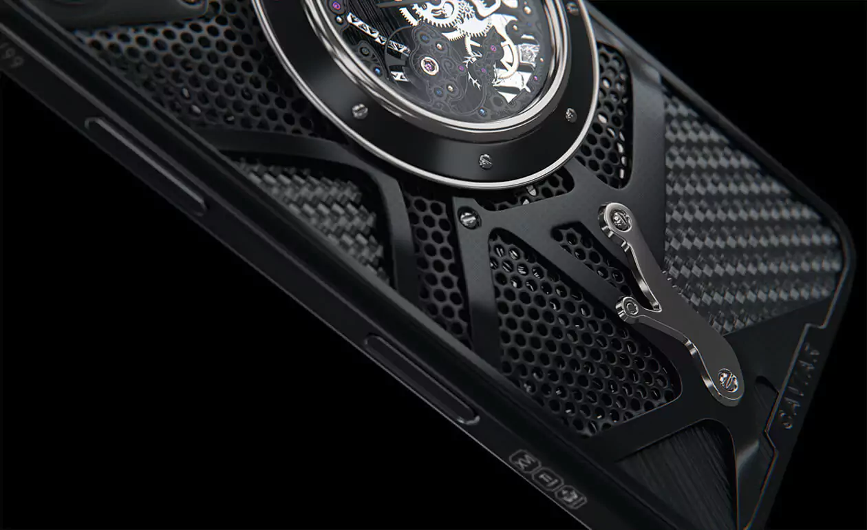 Если бы можно было создать скелетонизированный дизайн суперскоростного автомобиля, он был бы похож на Booster. Черные армированные решетки, холодное сияние титановых скрепляющих элементов, брутальные укрепляющие болты и часы-скелетоны, вмонтированные в корпус iPhone - как приятно разглядывать эти детали, как приятно держать в руках этот редкий акcессуар.