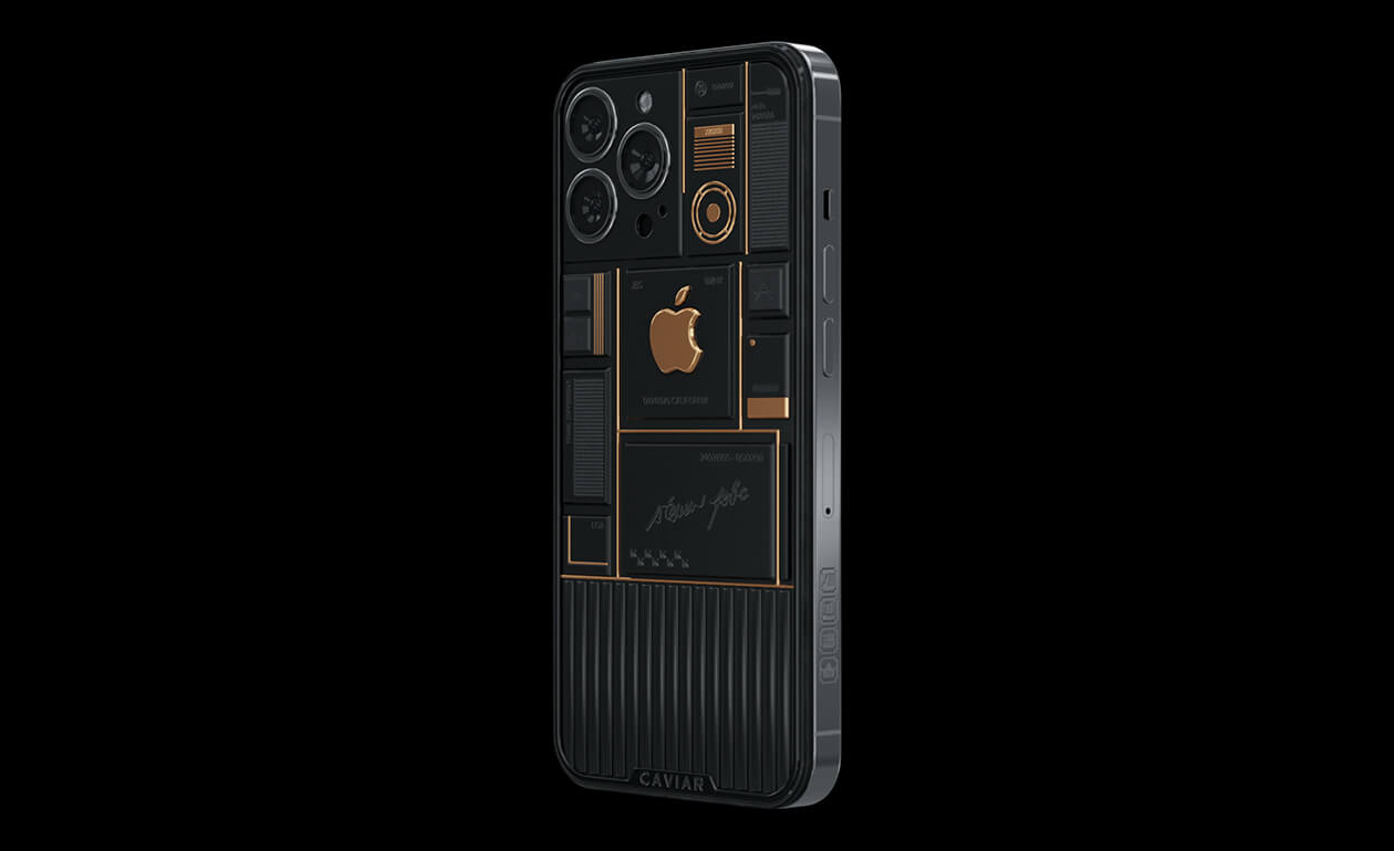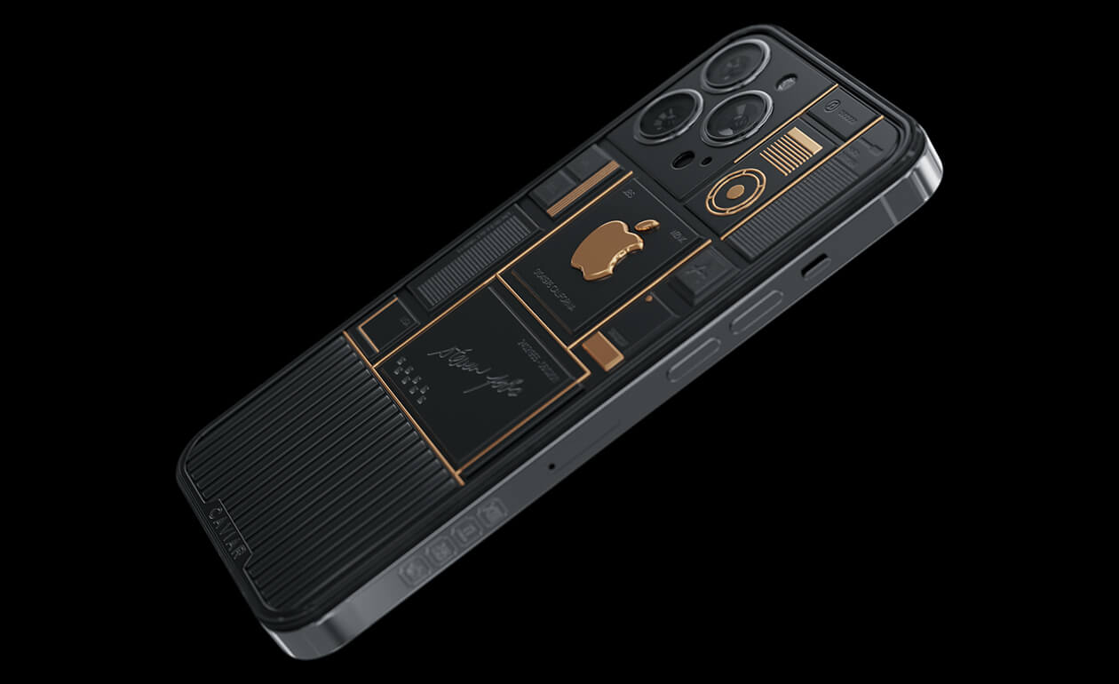 Кастомная модель iPhone 16 Pro, посвященная Стиву Джобсу, создана из ударопрочного титана с черным PVD-покрытием. Сердце дизайна - фирменное надкусанное яблоко Apple золотого цвета. Контрастные декоративные элементы, покрытые желтым 24-каратным золотом по технологии Double Electroplated, создают роскошный дуэт глубокого черного цвета и сияния драгоценного металла.