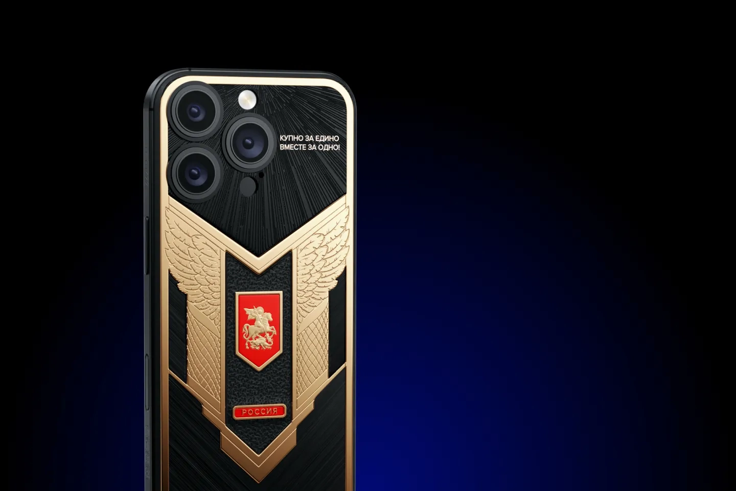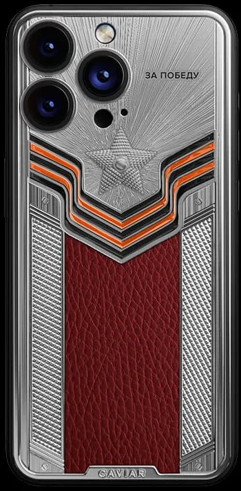 iPhone украшают символы Победы, выполненные в премиальных материалах: золото 999 пробы, авиационный титан и ювелирная эмаль.