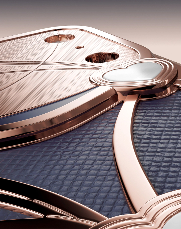 Вдохновение – легкость и чувственность ювелирных сердец Chopard. Переплетение линий из ювелирного сплава с двойным покрытием золотом создают ощущение лёгкости и ритма – сердца будто парят в танце. Натуральная кожа глубокого синего оттенка украшена вставками синего цвета в золотом обрамлении.