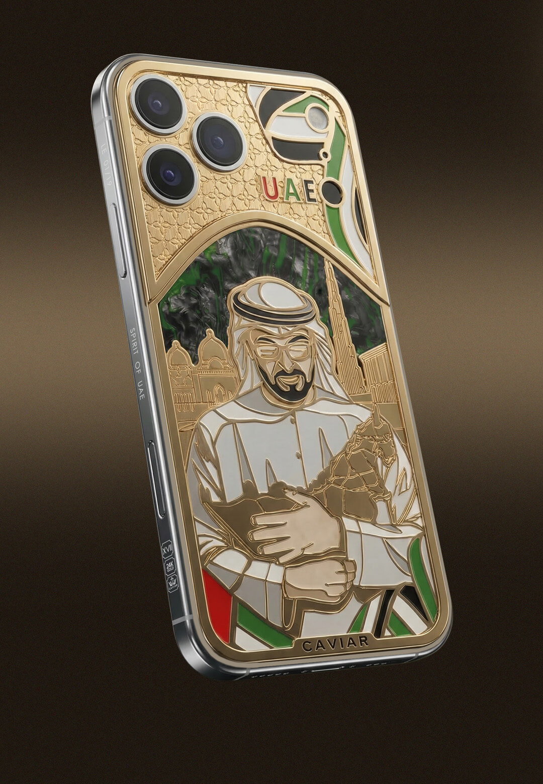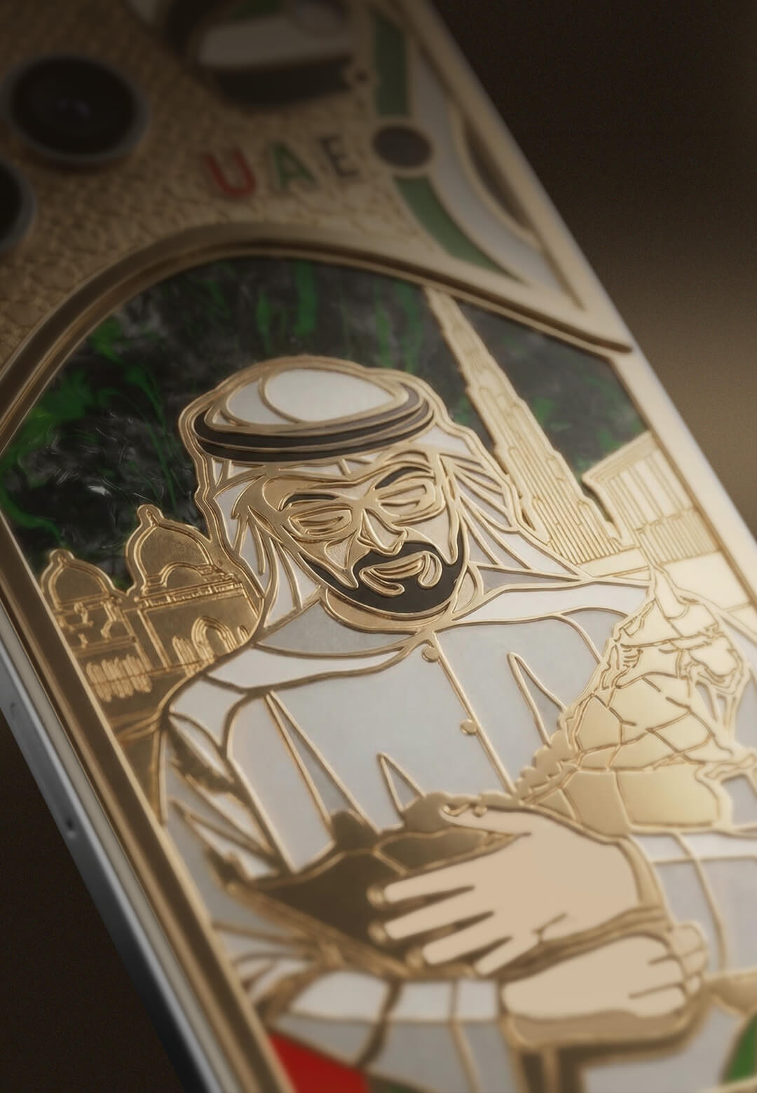 "Хранитель ОАЭ" – это новый кастомный смартфон, который символизирует поддержку Объединенных Арабских Эмиратов. Центральным элементом композиции стал образ Президента страны, Мохаммеда бин Зайда аль-Нахайяна, бережно держащего в руках карту государства.