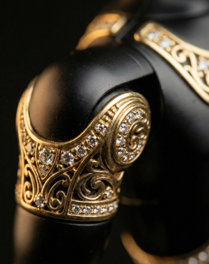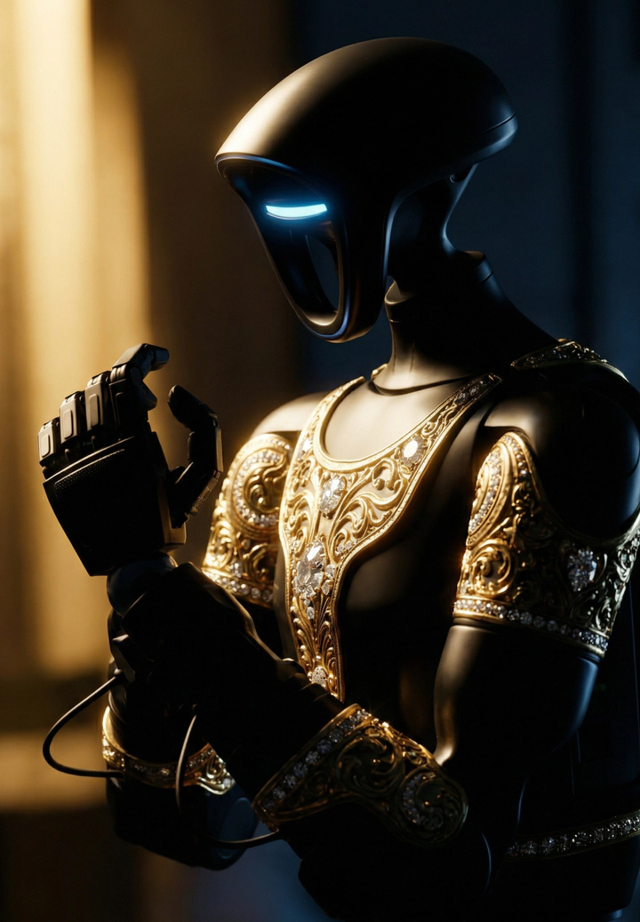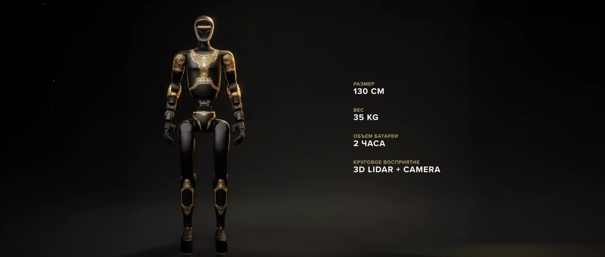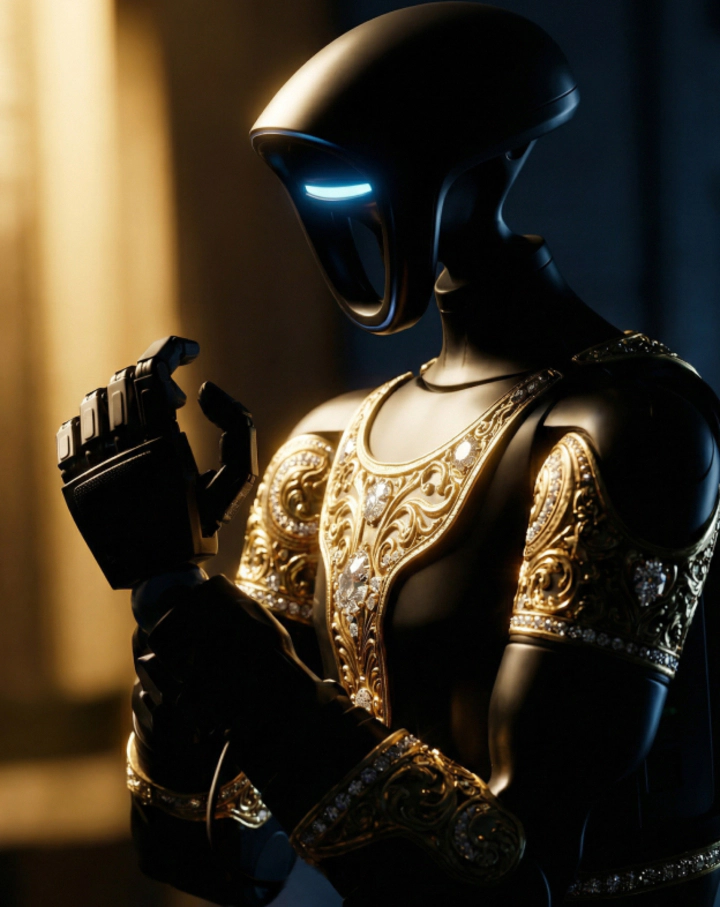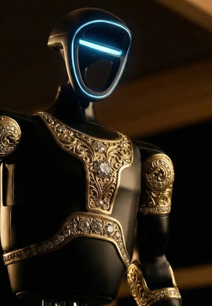 «Аладдин» впечатляет с первого взгляда, объединяя футуризм и восточную декоративную традицию. Его корпус выполнен в глубоком чёрном цвете и украшен тонкими позолоченными узорами. Арабески и орнаменты покрывают панели и суставы, придавая роботу вид роскошного артефакта. Чёрный цвет символизирует глубину и бесконечность знаний, а золото – власть, мудрость и ценность. В движении позолота мягко мерцает, создавая ощущение ожившего сокровища из восточной легенды.